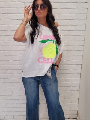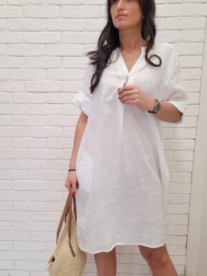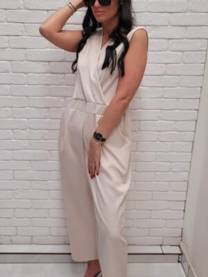 Biały komplet z luźną bluzką i spodniami, wykończony złotymi detalami przy dekolcie, rękawach i pasie. W zestawie stylowy naszyjnik.