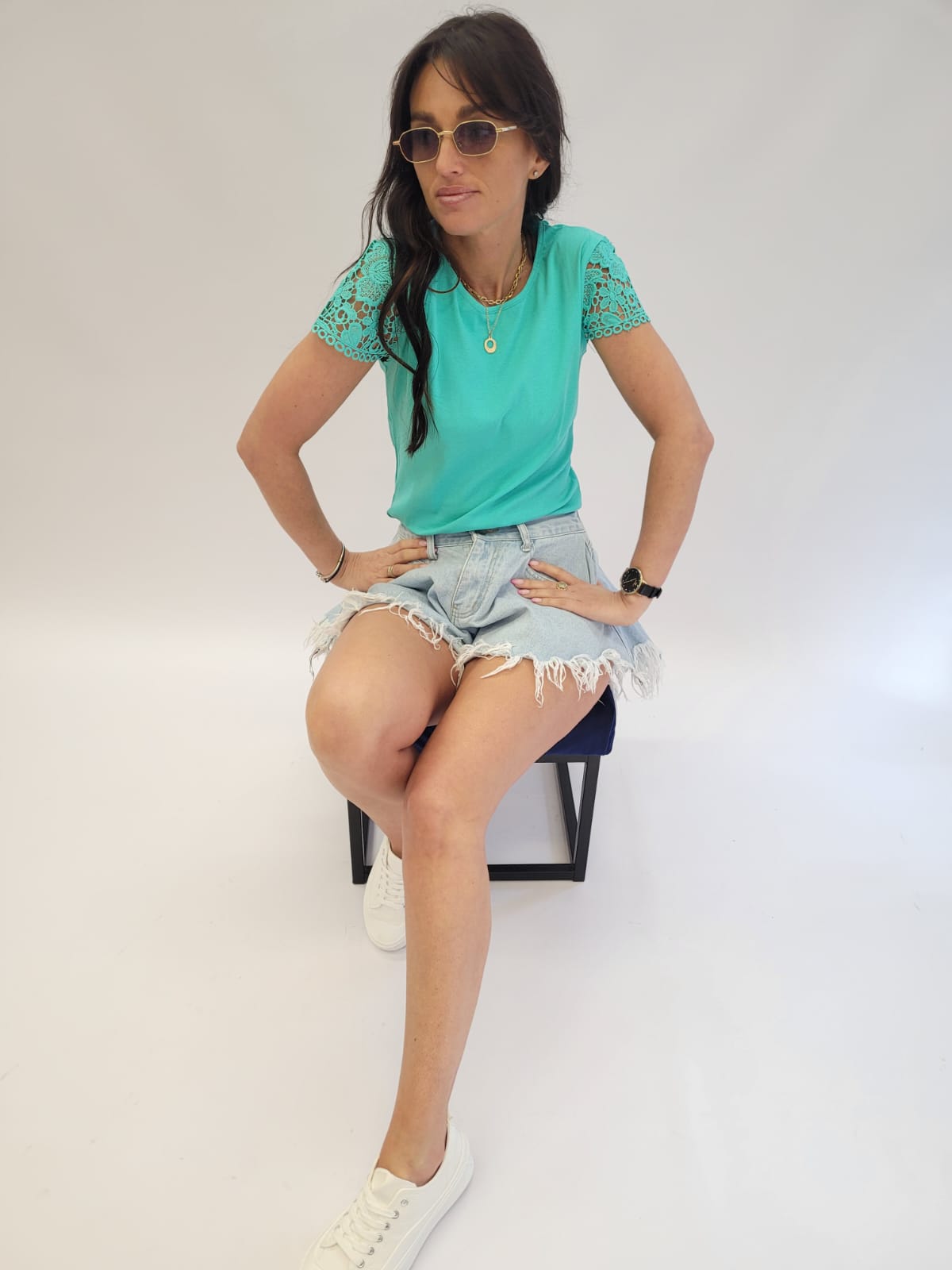 Bawełniana bluzka z krótkim rękawem gładka ozdobiona koronką jasna zieleń