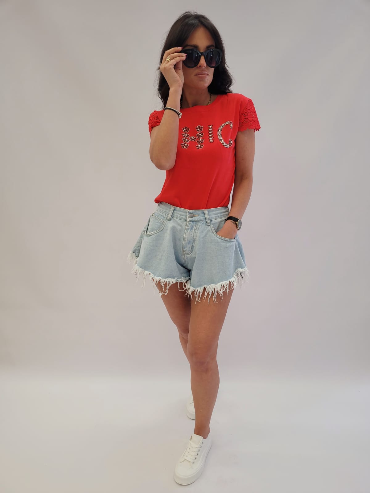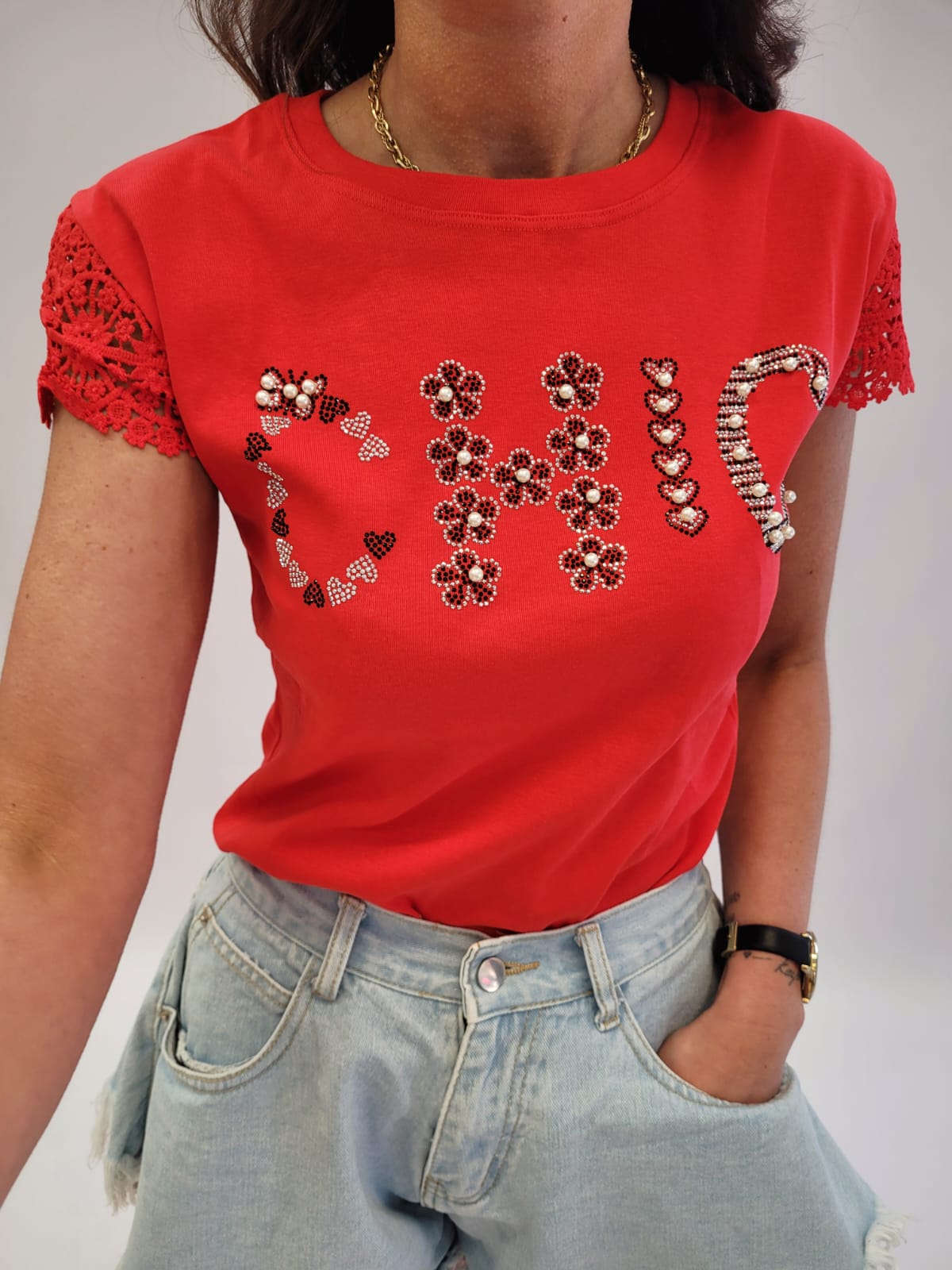 Bawełniana bluzka z krótkim rękawem gładka z napisem koronkowy rękaw czerwona