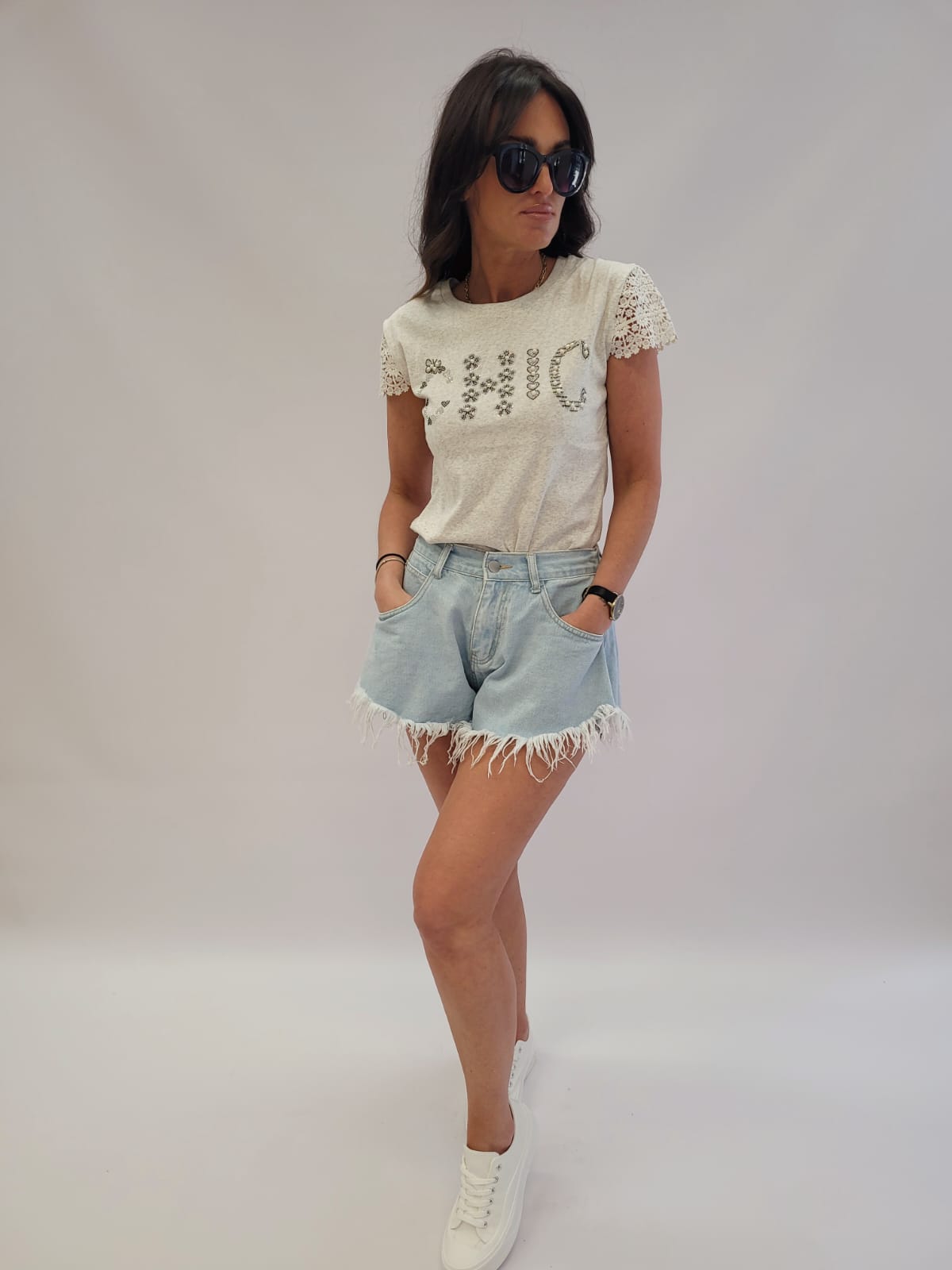 Bawełniana bluzka z krótkim rękawem gładka z napisem koronkowy rękaw jasno szara