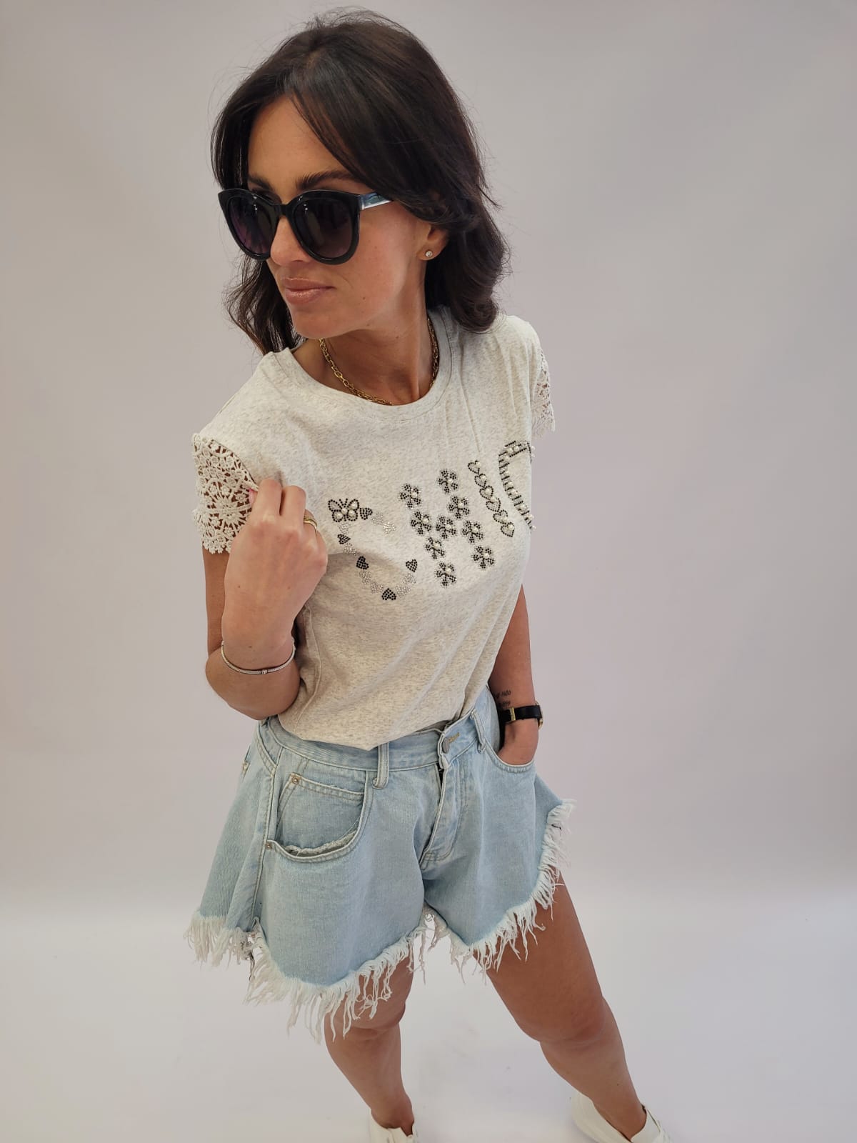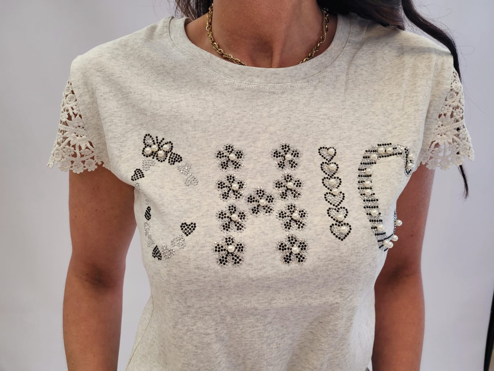 Gładka bluzka z koronkowym wykończeniem rękawów. Ozdobny napis wyszywany cykoriami i perełkami.