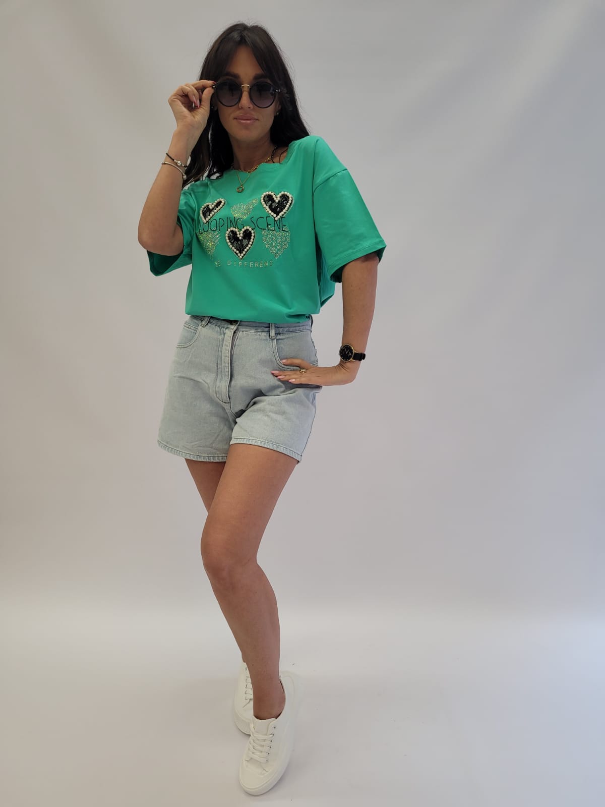 Bawełniana bluzka z krótkim rękawem gładka z wyszywanymi serduszkami zielona