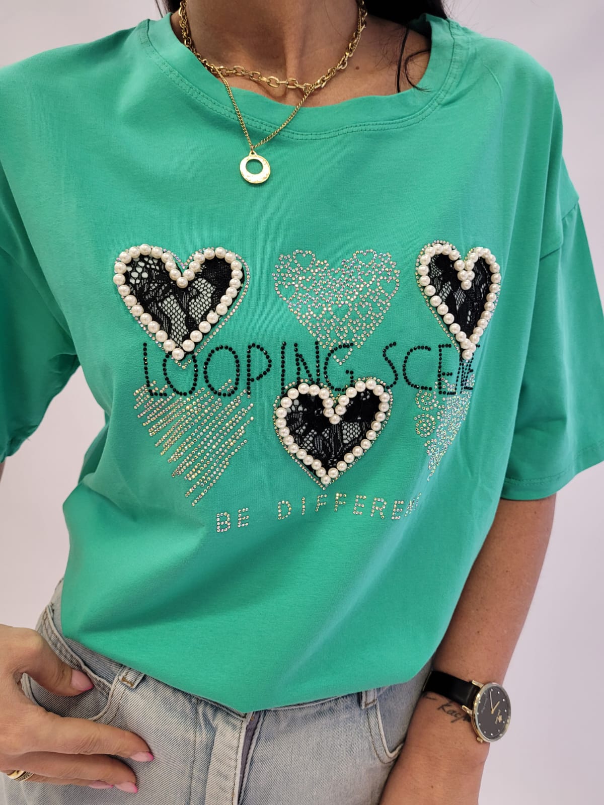 Bawełniana bluzka z krótkim rękawem. Gładka z ozdobnym wzorem w serduszka wyszywane perełkami oraz cekinowym napisem.