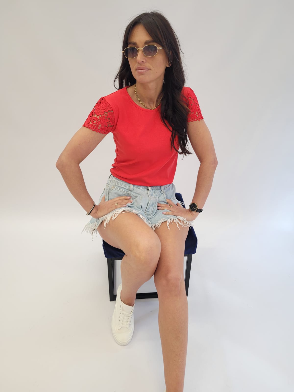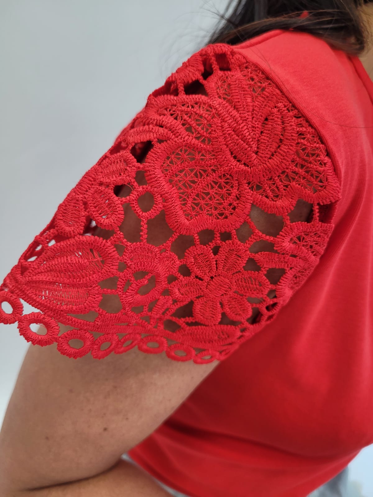 Bawełniana gładka bluzka wykończona koronką na rękawach i na plecach w kolorze czerwonym.
