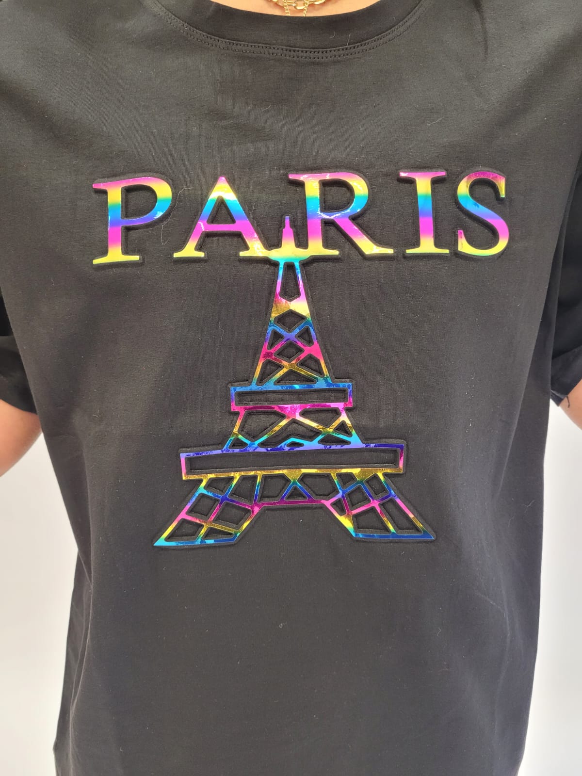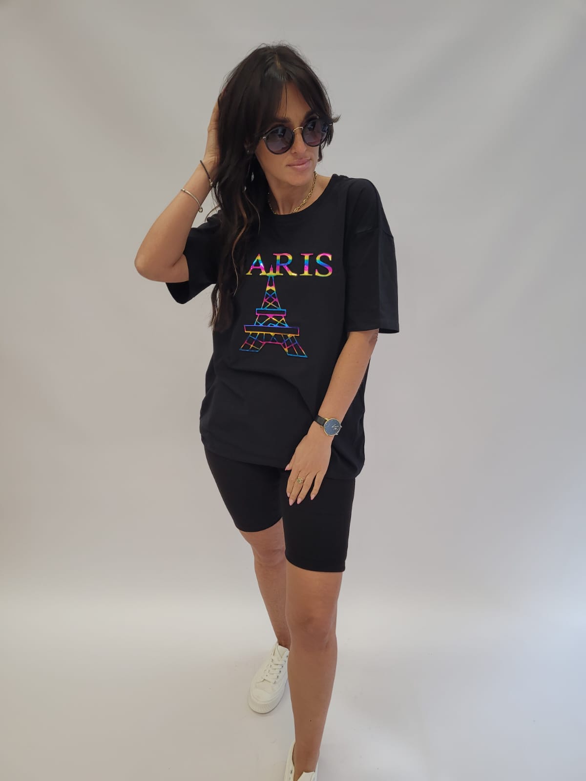 Bawełniana gładka bluzka z krótkim rękawem czarna z kolorowym wzorem