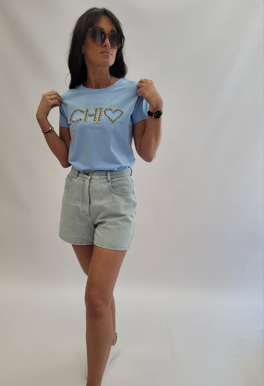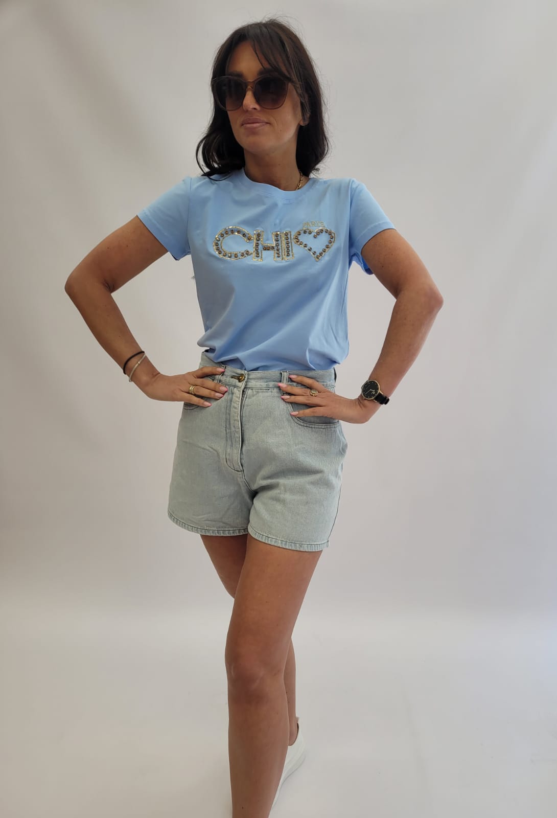 Bluzka z krótkim rękawem w błękitnym kolorze. Gładka ozdobiona napisem z cykoriami.