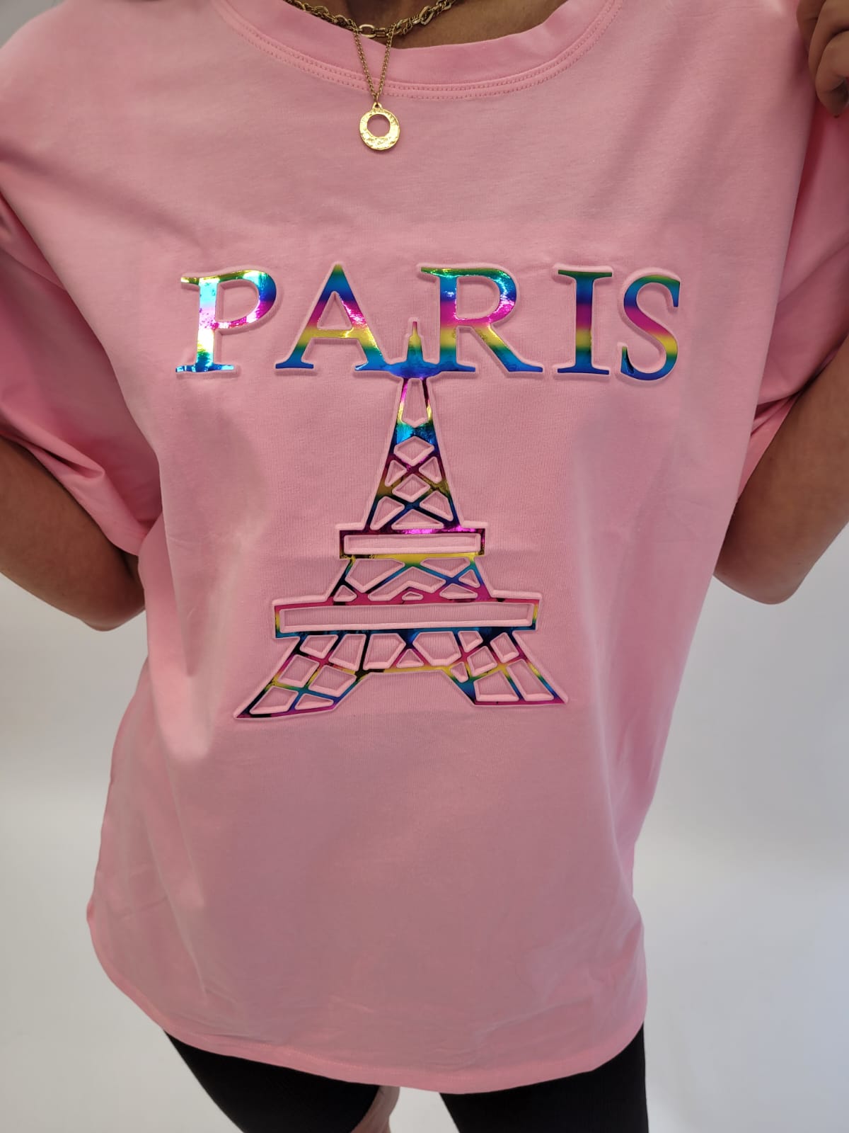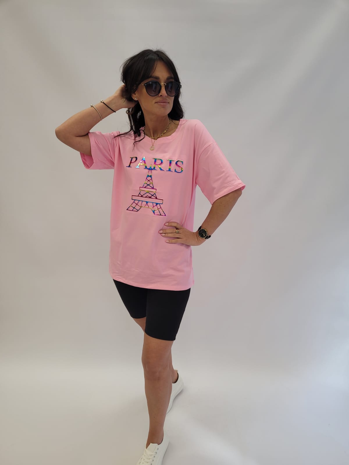Bawełniana gładka bluzka z krótkim rękawem różowa z kolorowym wzorem