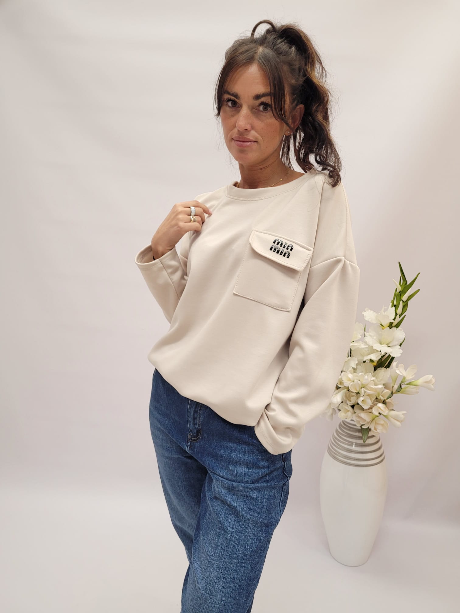 Krótka bluza o uniwersalnym kroju to must- have w każdej garderobie. Wygodna, miękka i przyjemna w dotyku- idealna na co dzień. Dzięki prostemu fasonowi świetnie łączy się zarówno z jeansami, legginsami jak i spódnicami. Kieszonka z modnym napisem dodaje bluzie stylu.