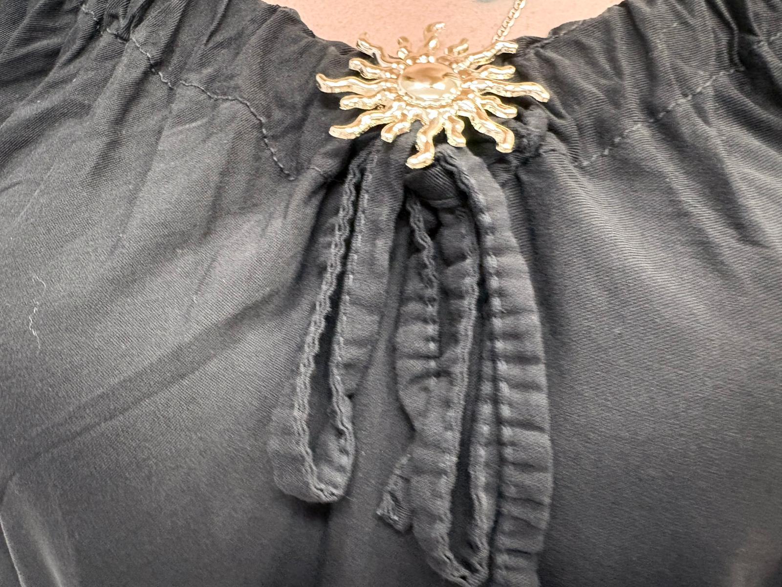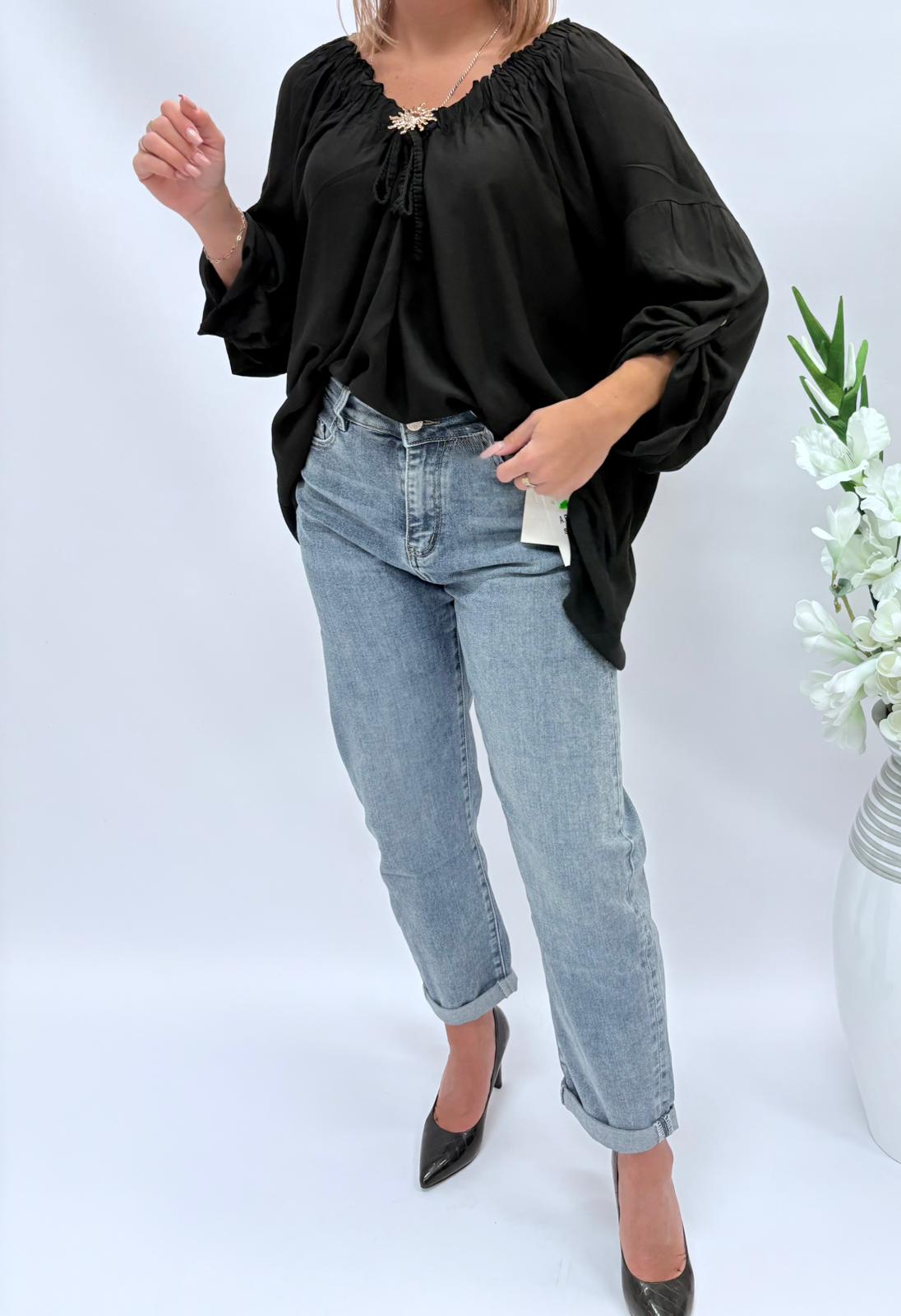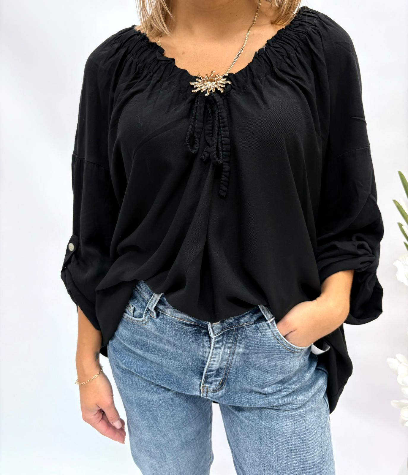 Elegancka i jednocześnie wygodna – ta luźna bluzka to idealny wybór na co dzień i na wyjątkową okazję. Posiada subtelny dekolt z ściągaczem który pozwala dowolnie regulować jego głębokość, a ozdobna broszka dodaje stylowego akcentu .