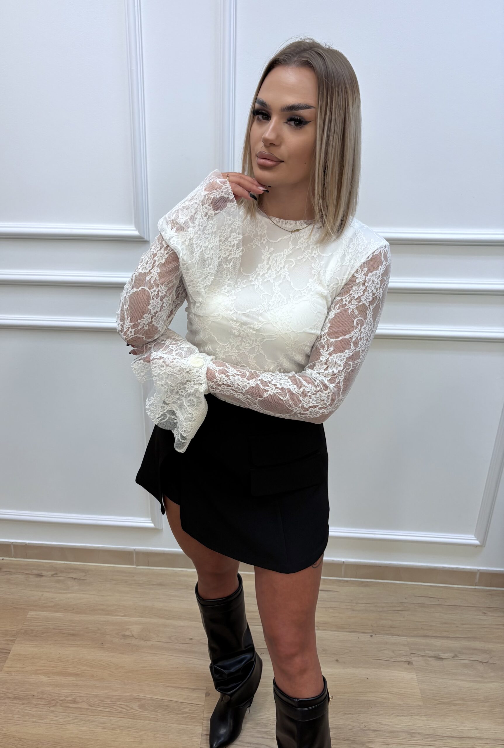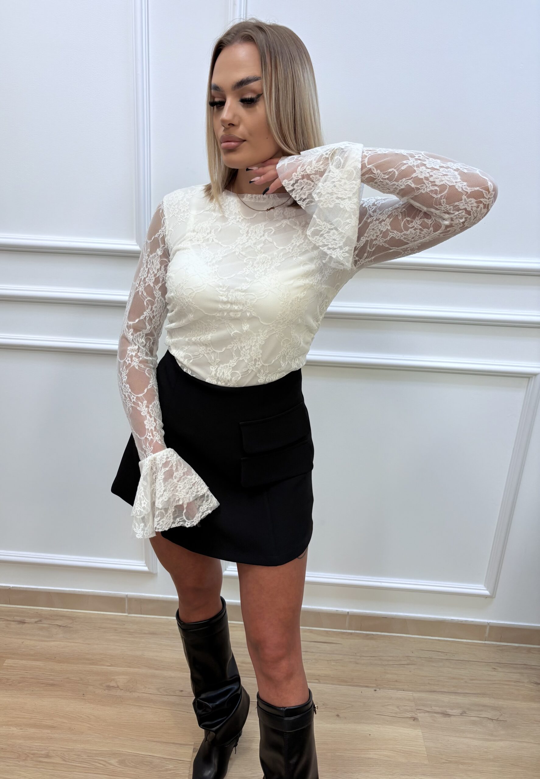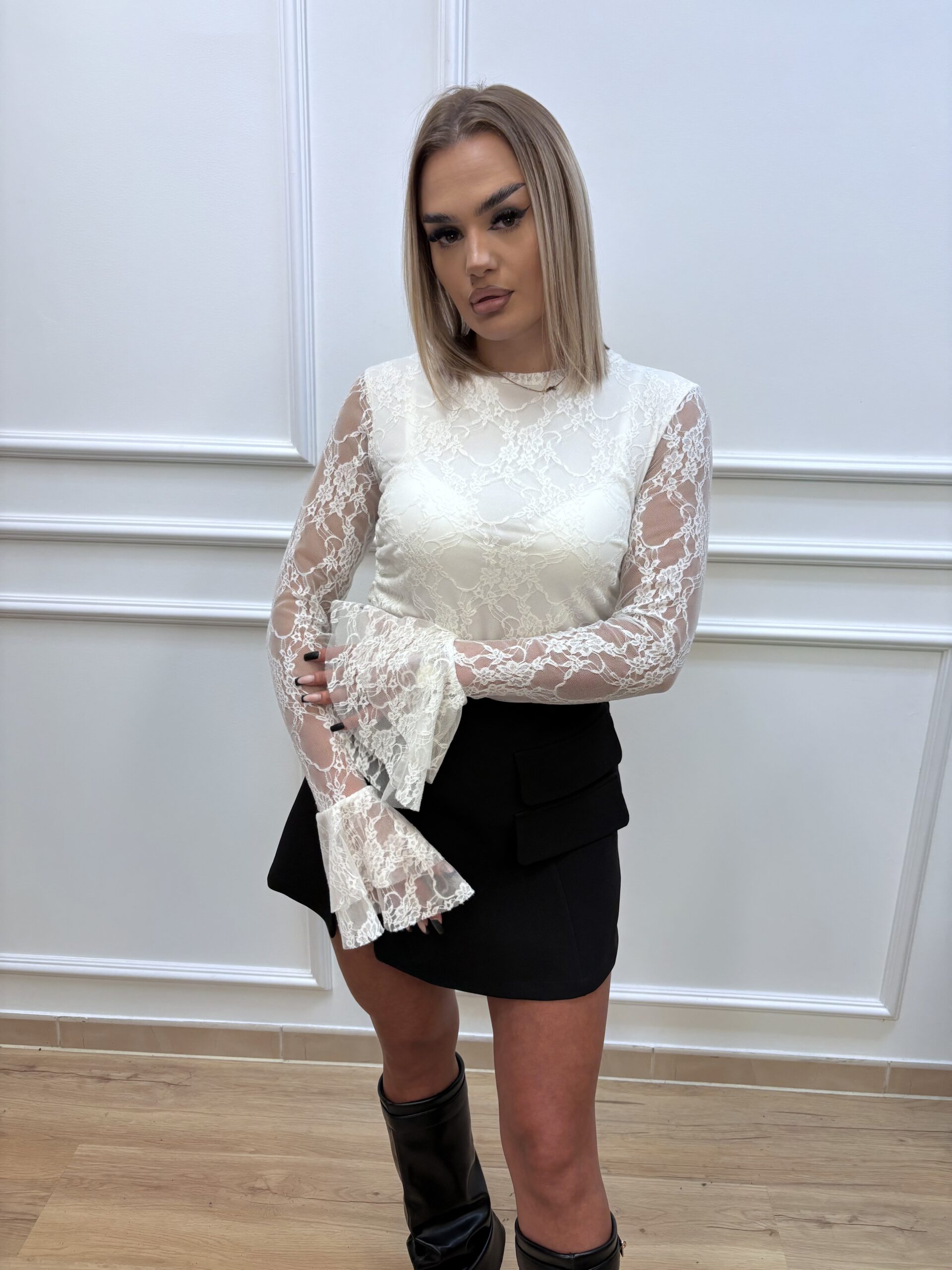 Elegancka i kobieca bluzka wykonana z subtelnej koronki, podszyta miękką, lekką tkaniną, która zapewnia komfort noszenia. Rękawy ozdobione piękną falbanką, dodają romantycznego i stylowego charakteru.