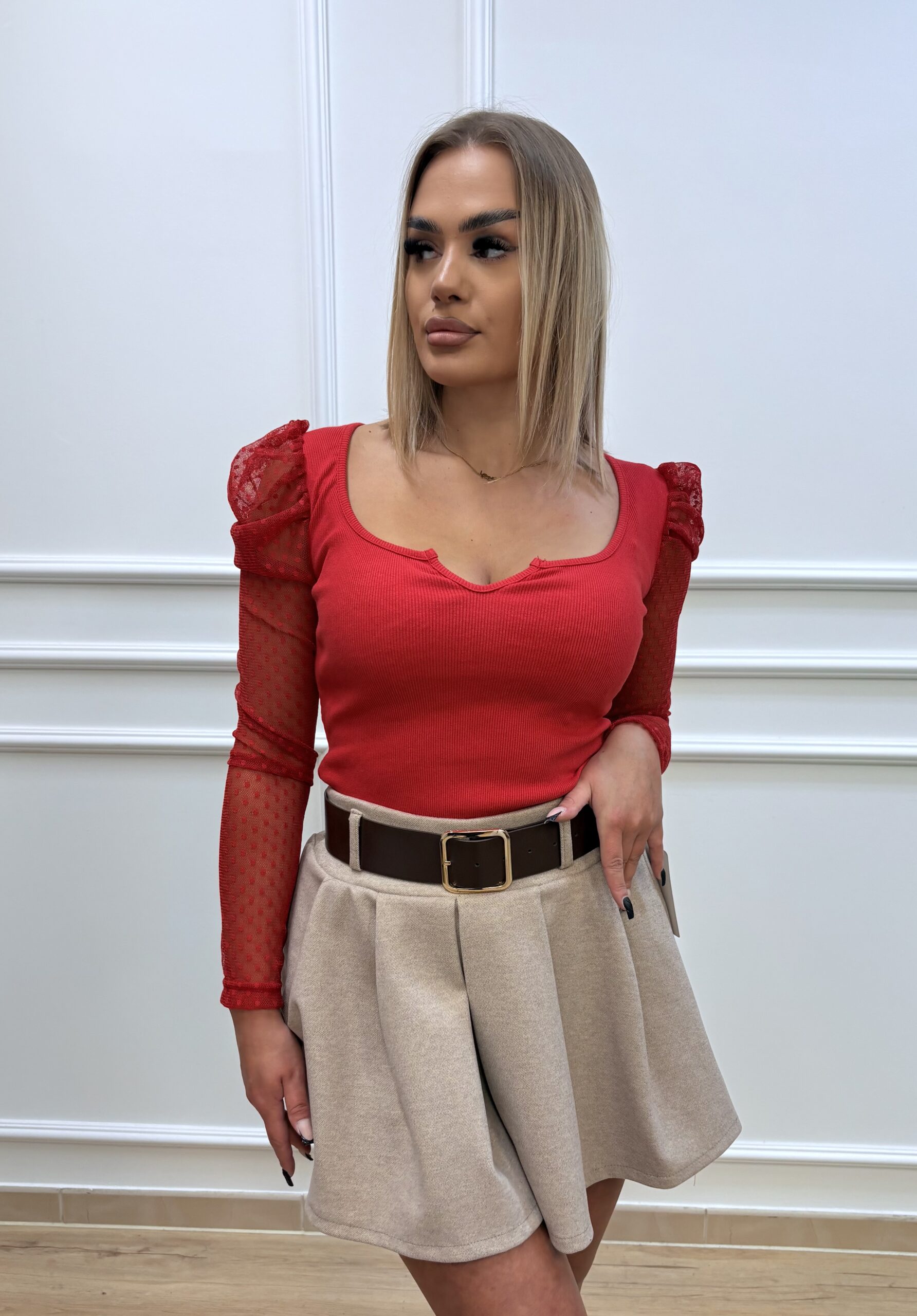 Bluzka damska z efektownymi tiulowymi rękawami- czerwona