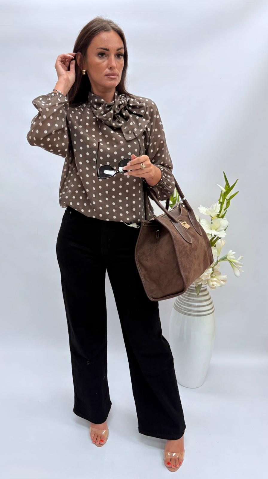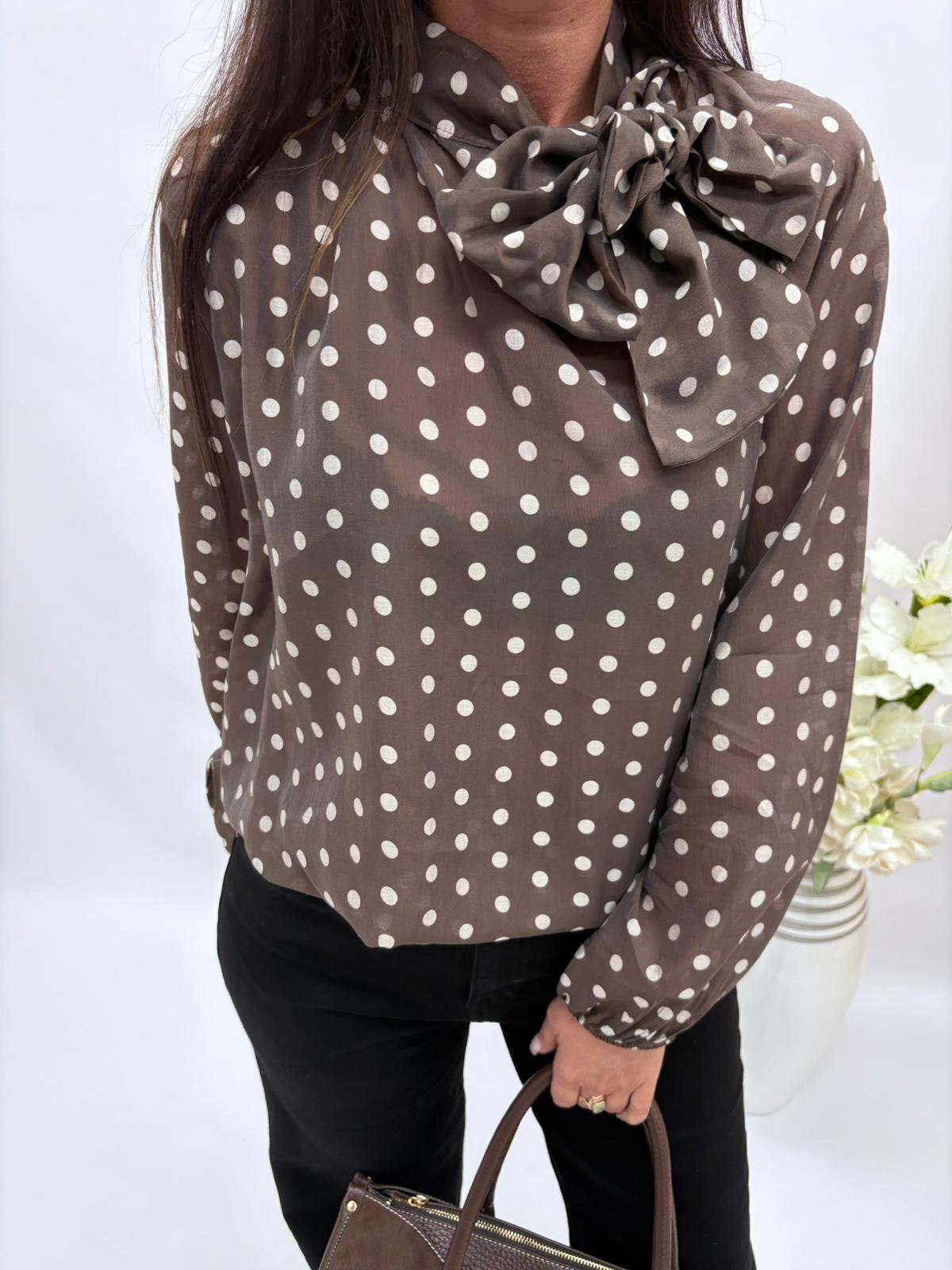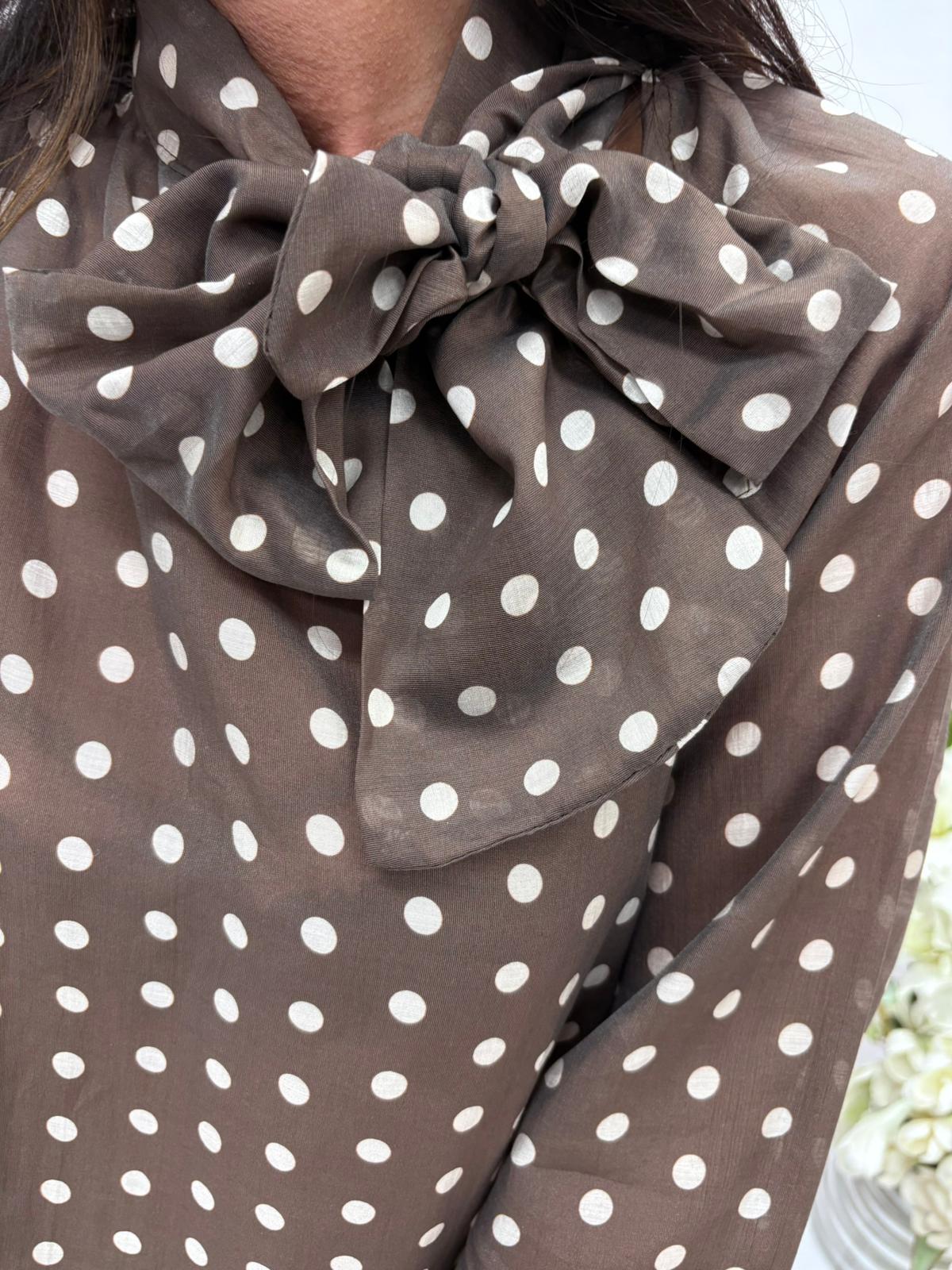 Bluzka długi rękaw wiązana pod szyją groszki brązowe