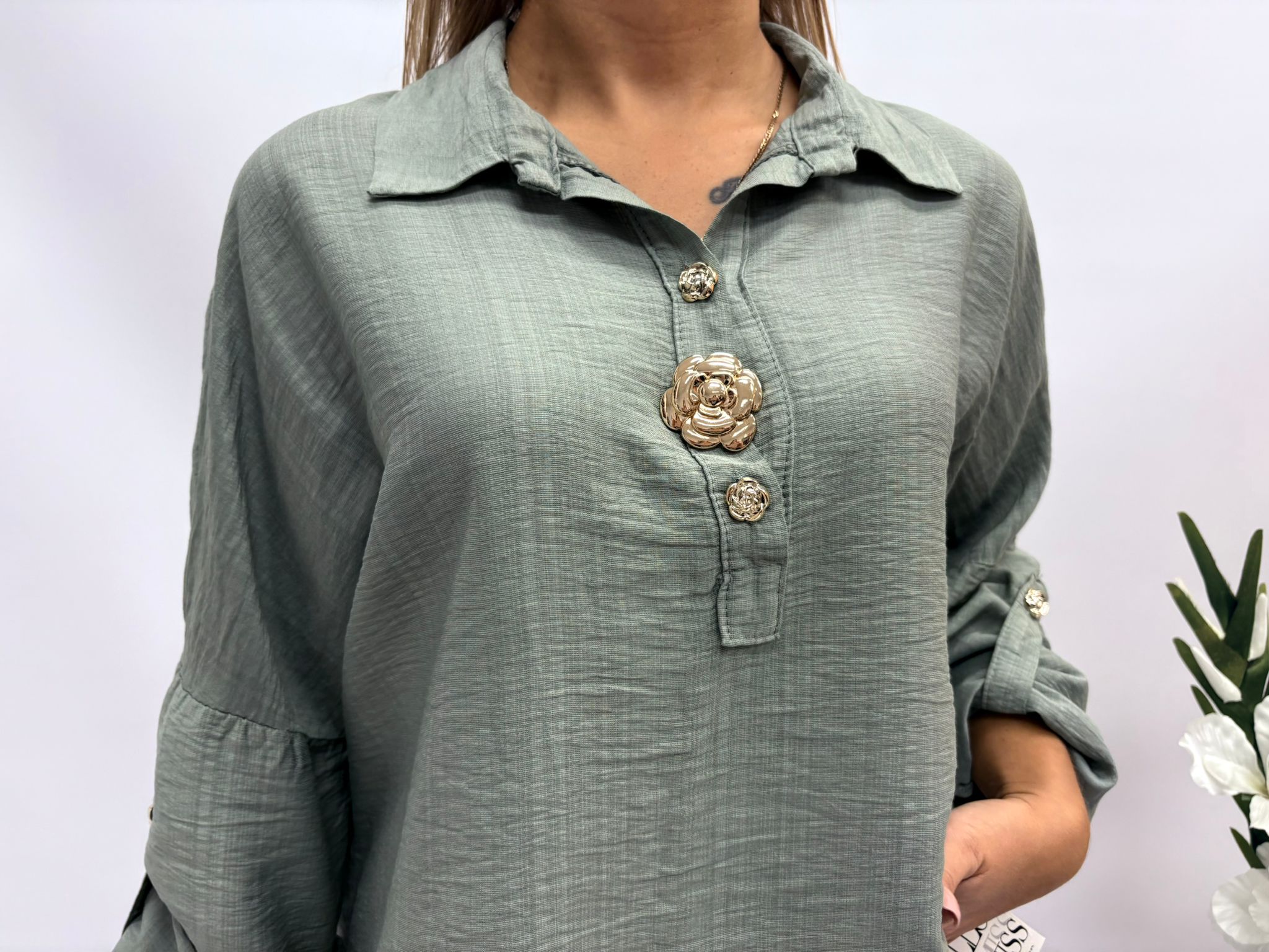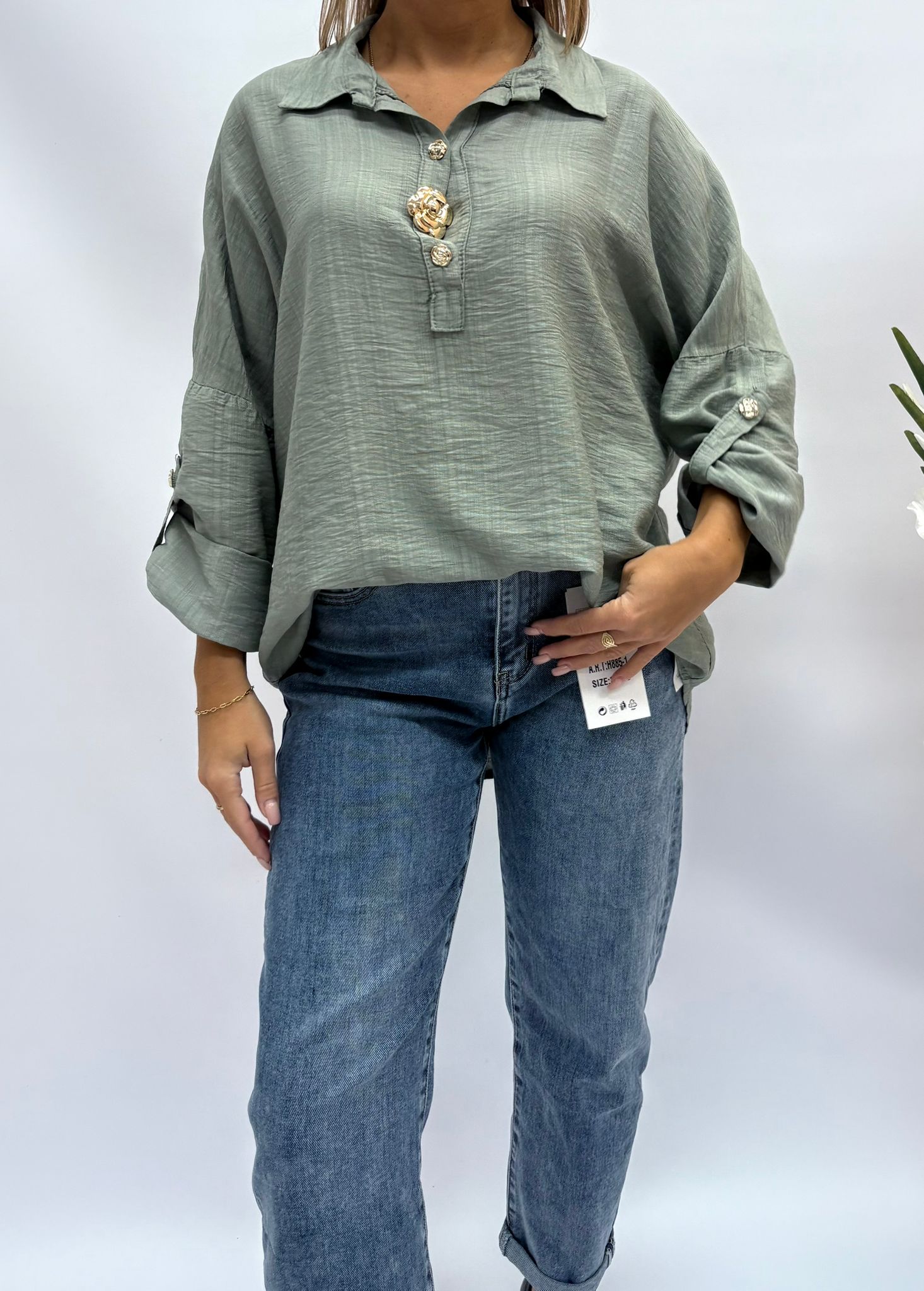 Luźna bluzka z ozdobnymi guzikami – lekka i wygodna o swobodnym kroju, z efektownymi guzikami dodającymi elegancji. Idealna do codziennych i stylowych zestawów.