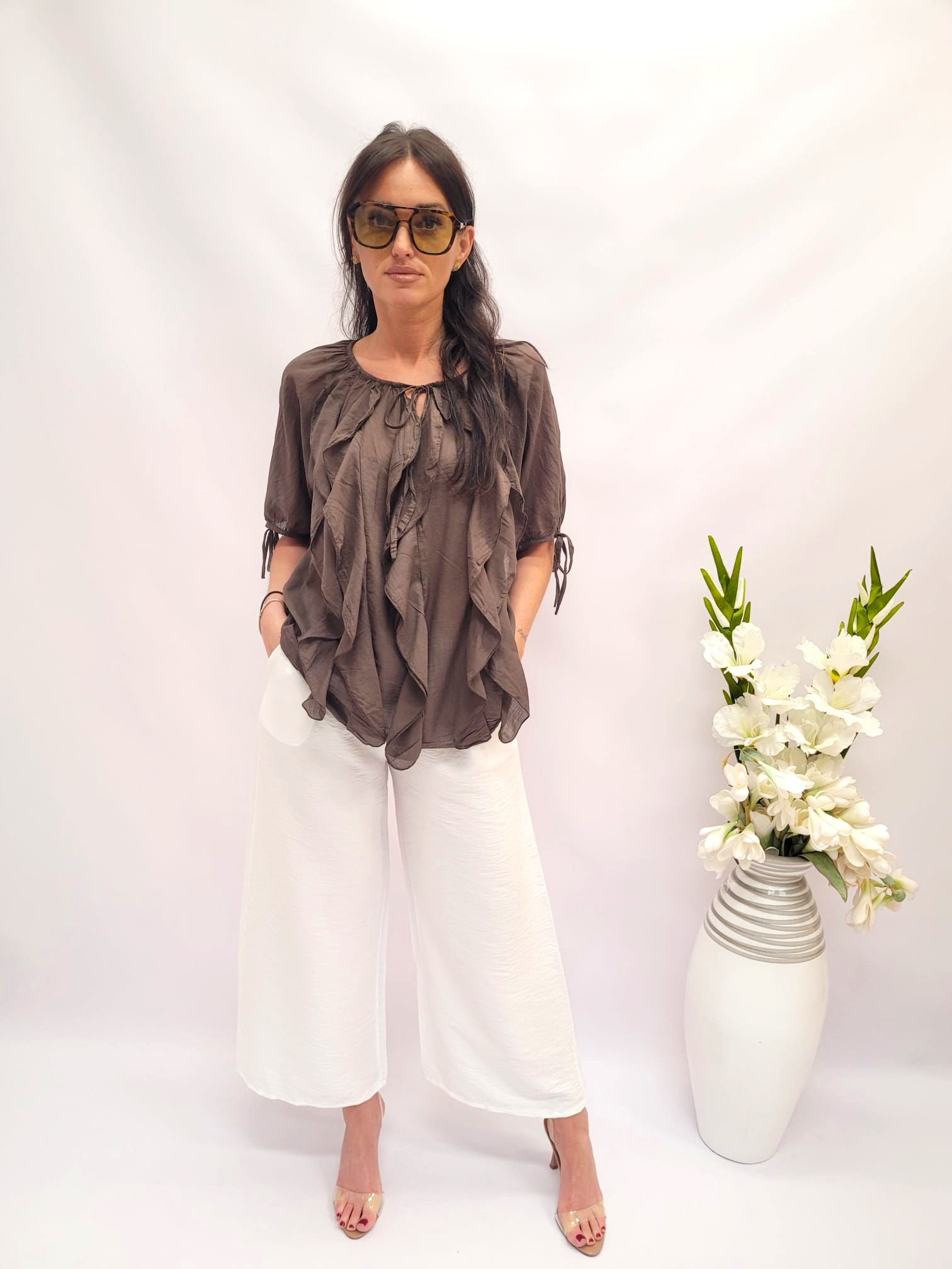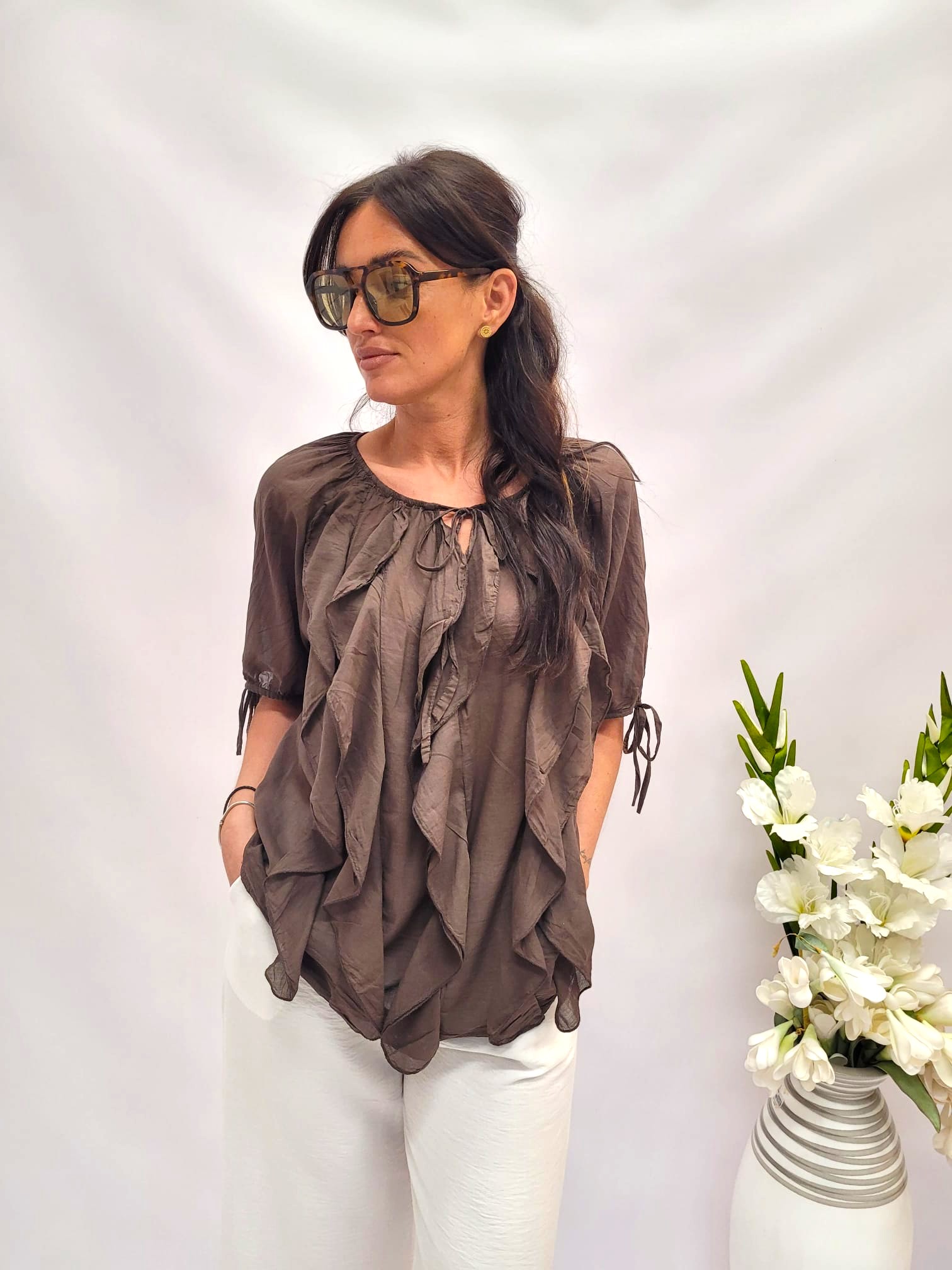 Ta niezwykle kobieca bluzka zachwyca swoją lekkością i subtelnością. Wykonana z delikatnej bawełny pięknie układa się na sylwetce tworząc romantyczny, eteryczny look. Falbany dodają jej lekkości i dziewczęcego uroku a luźny krój zapewnia swobodę ruchów i wygodę noszenia.