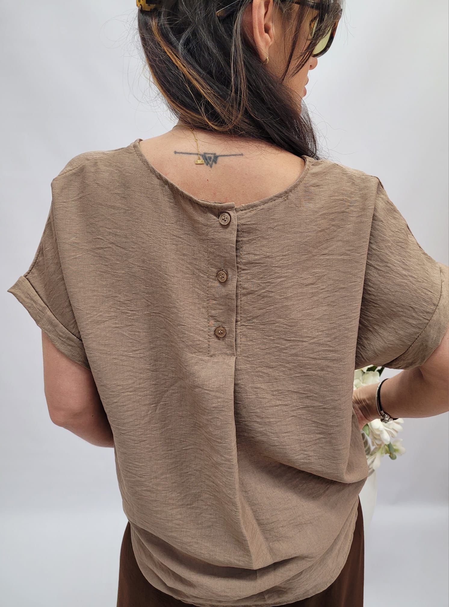 Bluzka z krótkim rękawem z ozdobnymi guzikami na plecach.