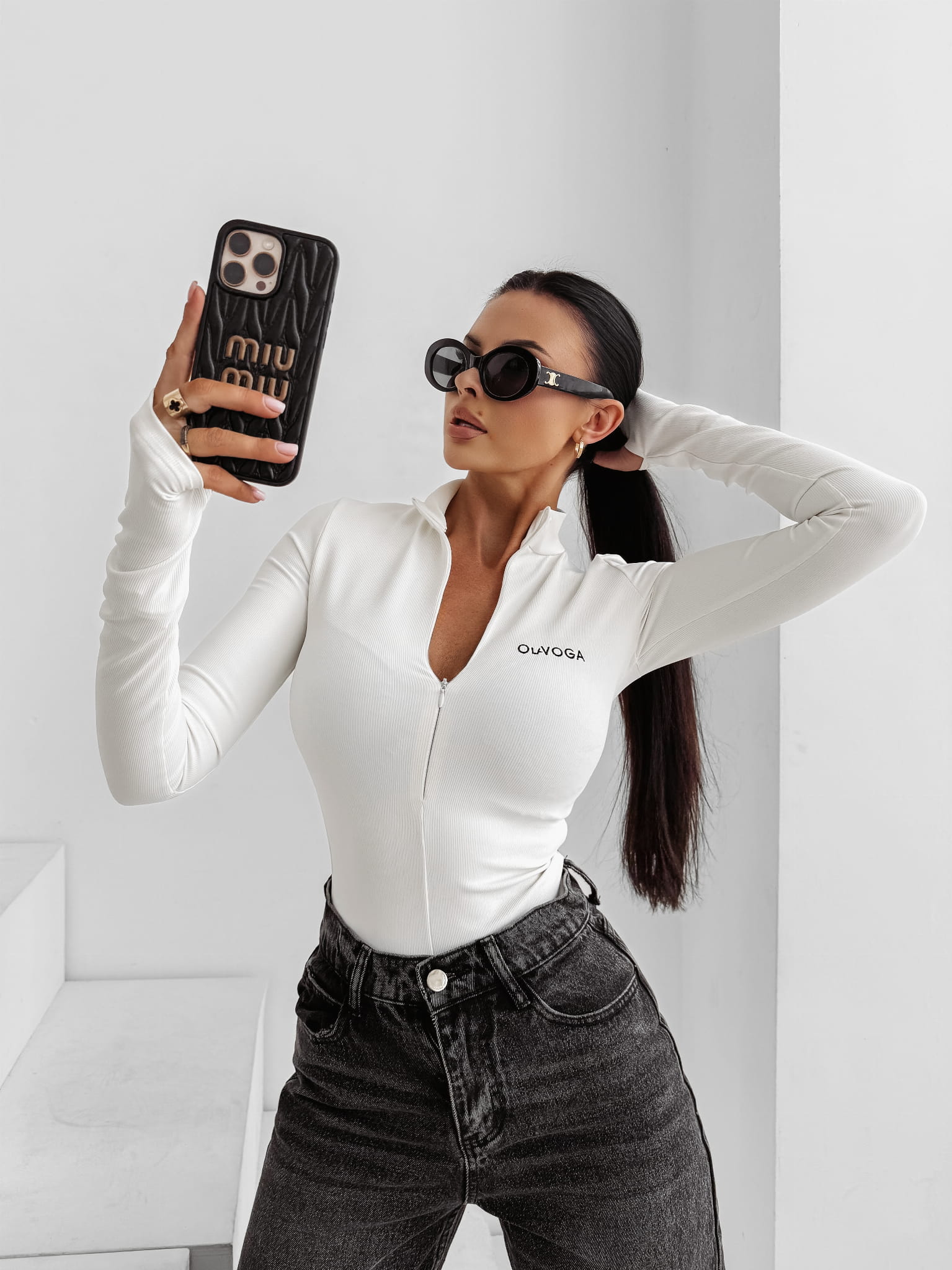 Idealnie dopasowane body o sportowo-eleganckim charakterze. Wykonane z wysokiej jakości elastycznego, prążkowanego materiału. Model z długim rękawem, który posiada wycięcie na kciuk. Praktyczny suwak, który pozwala regulować głębokość dekoltu. Na przodzie subtelne, kontrastowe logo marki OLAVOGA.