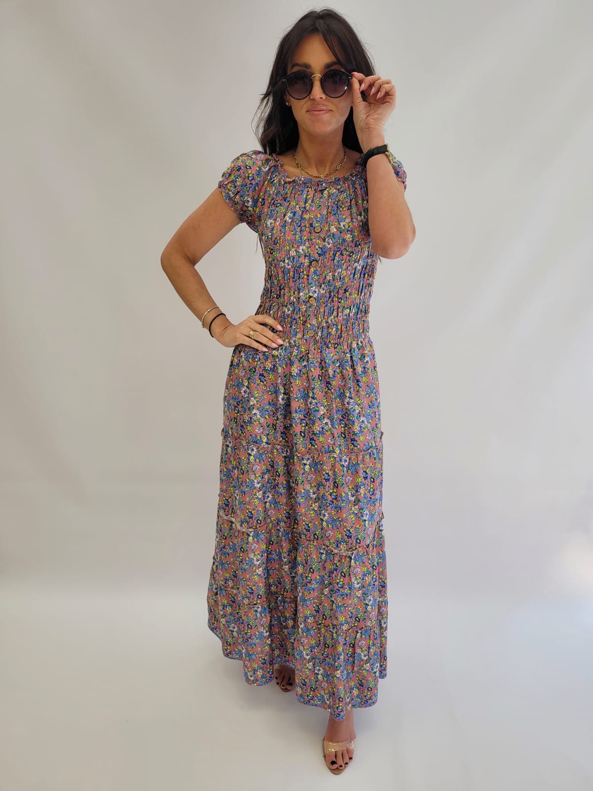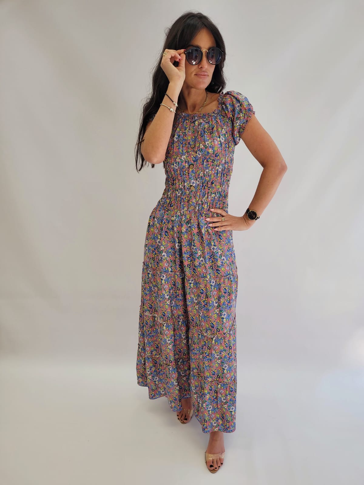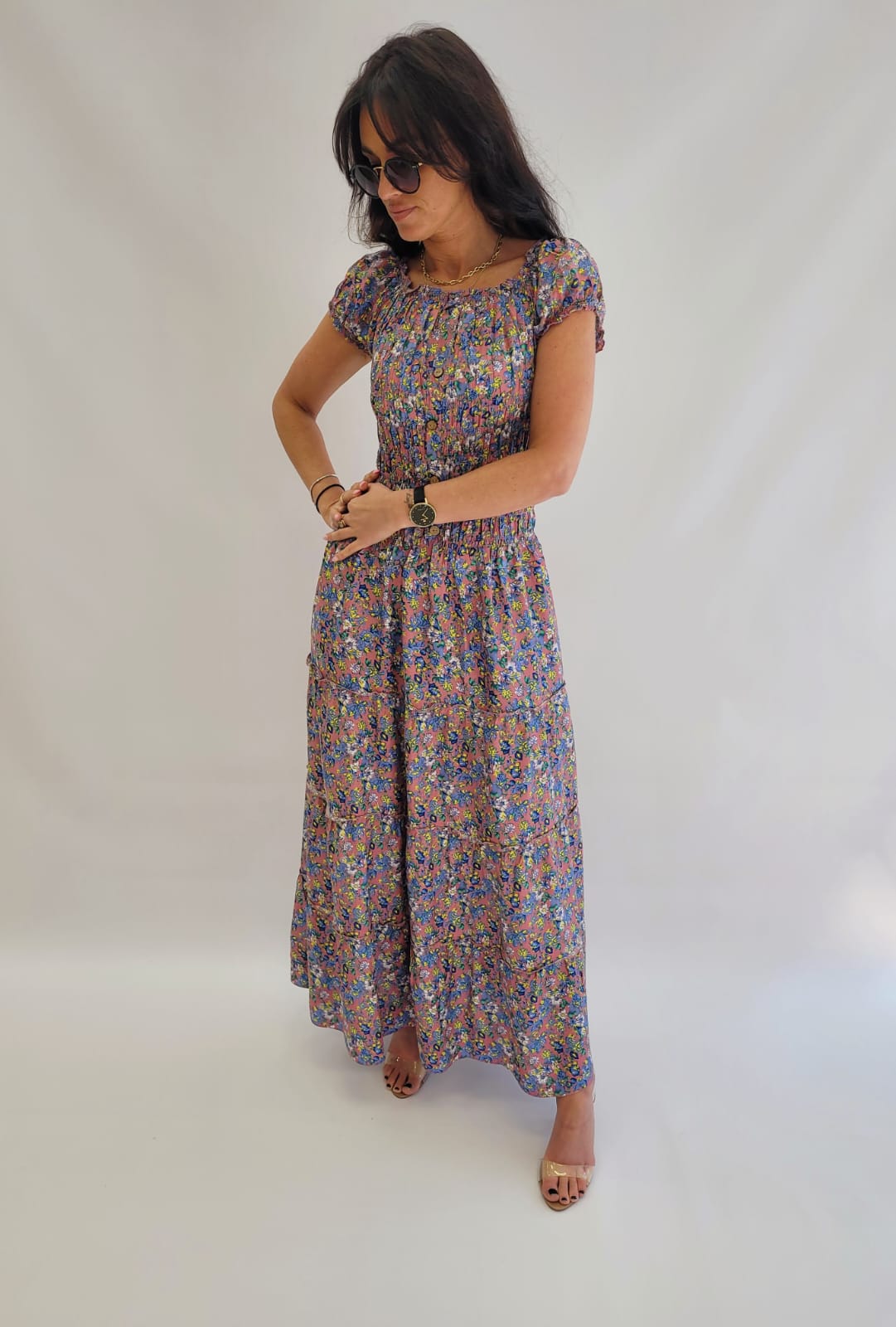Długa kwiecista sukienka z dekoltem w hiszpańskim stylu gumka w pasie