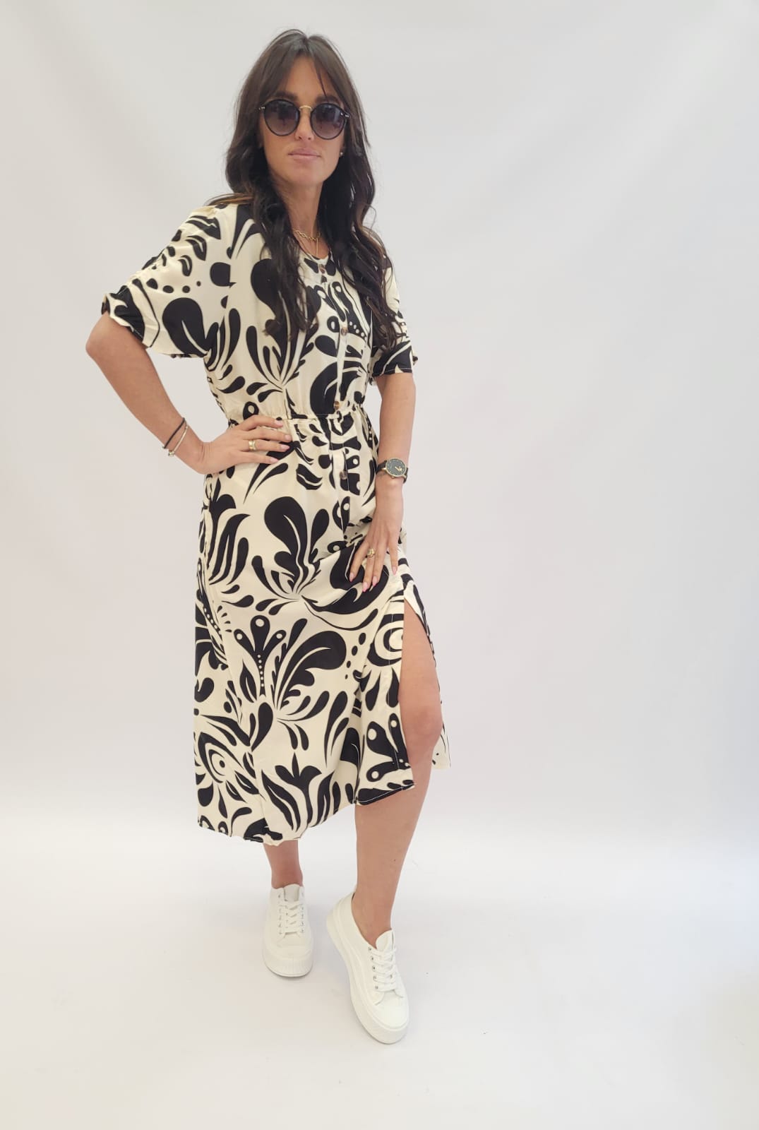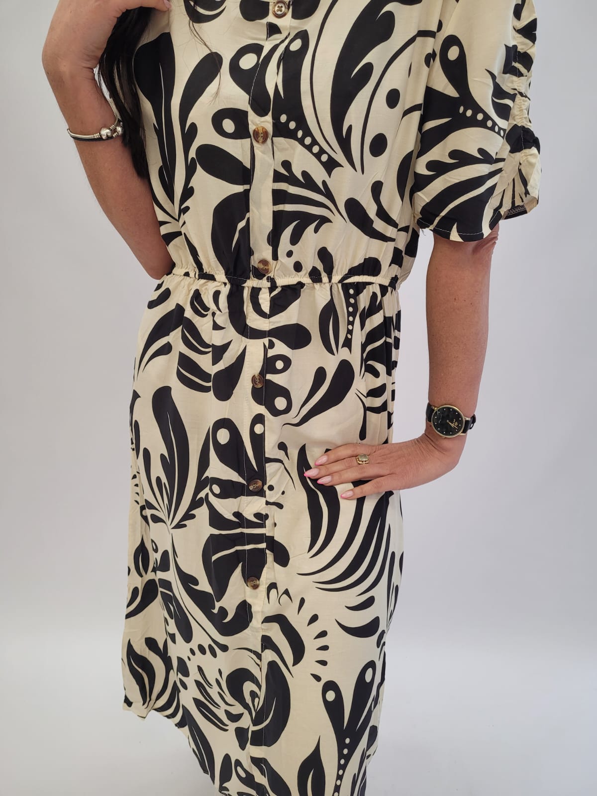 Długa sukienka z rękawem i gumką w pasie wzór kolor ecri- czarny