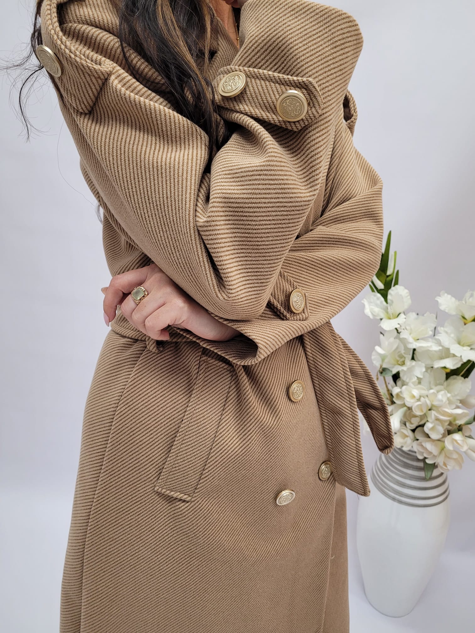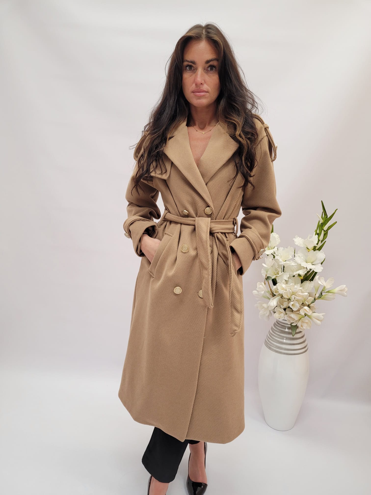 Długi płaszcz typu trencz z dwoma rzędami guzików to kwintesencja elegancji i ponadczasowego stylu. Pięknie układa się na sylwetce, podkreślając jej kształty.