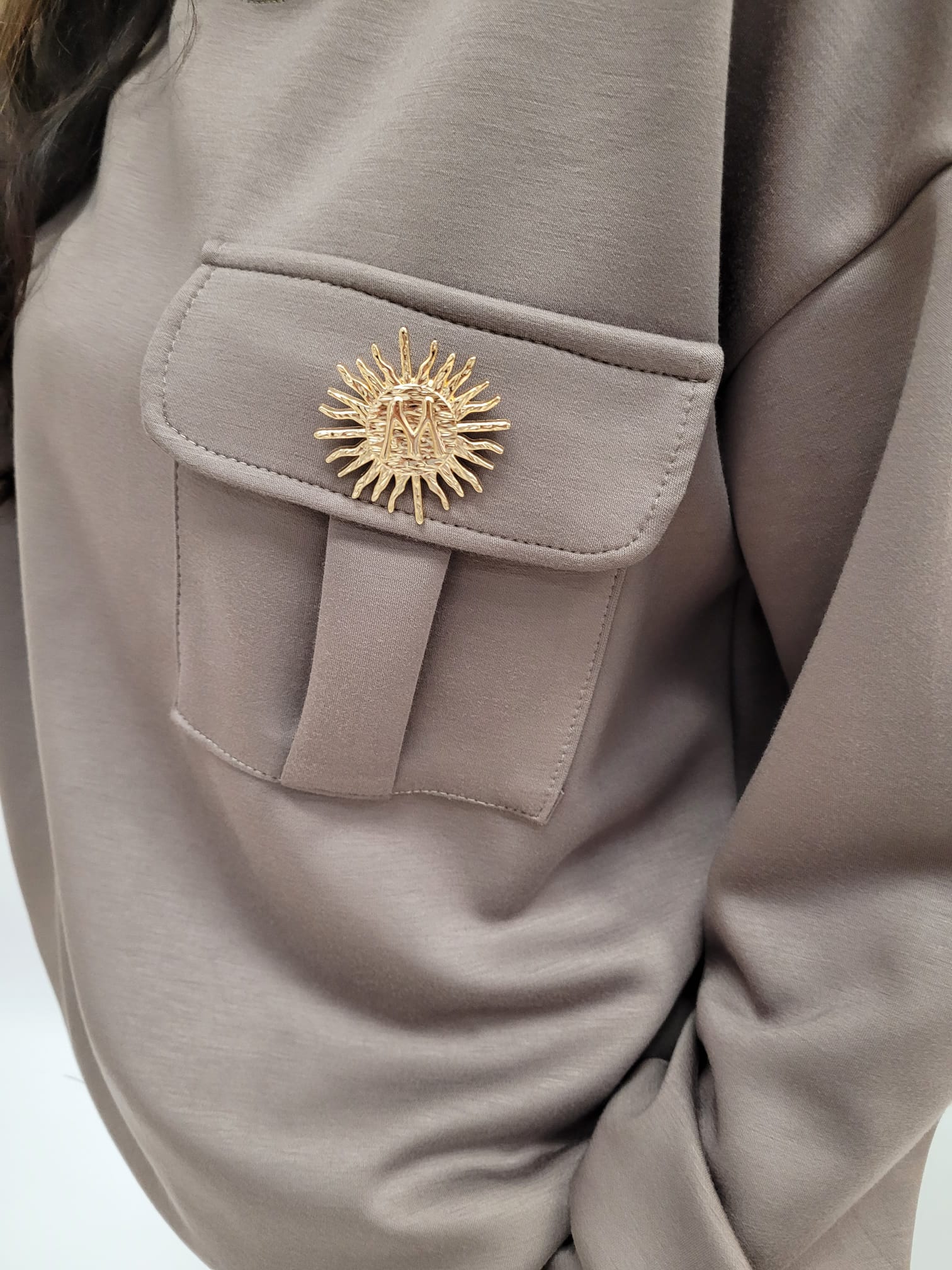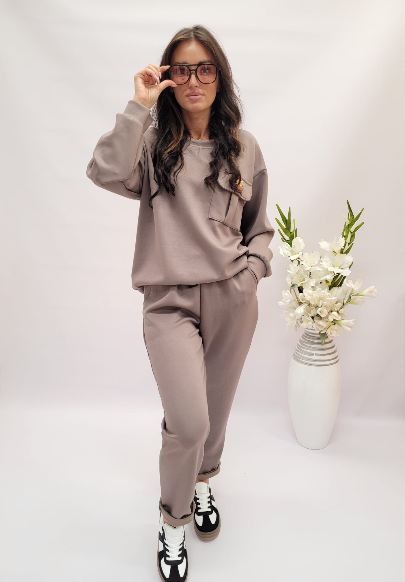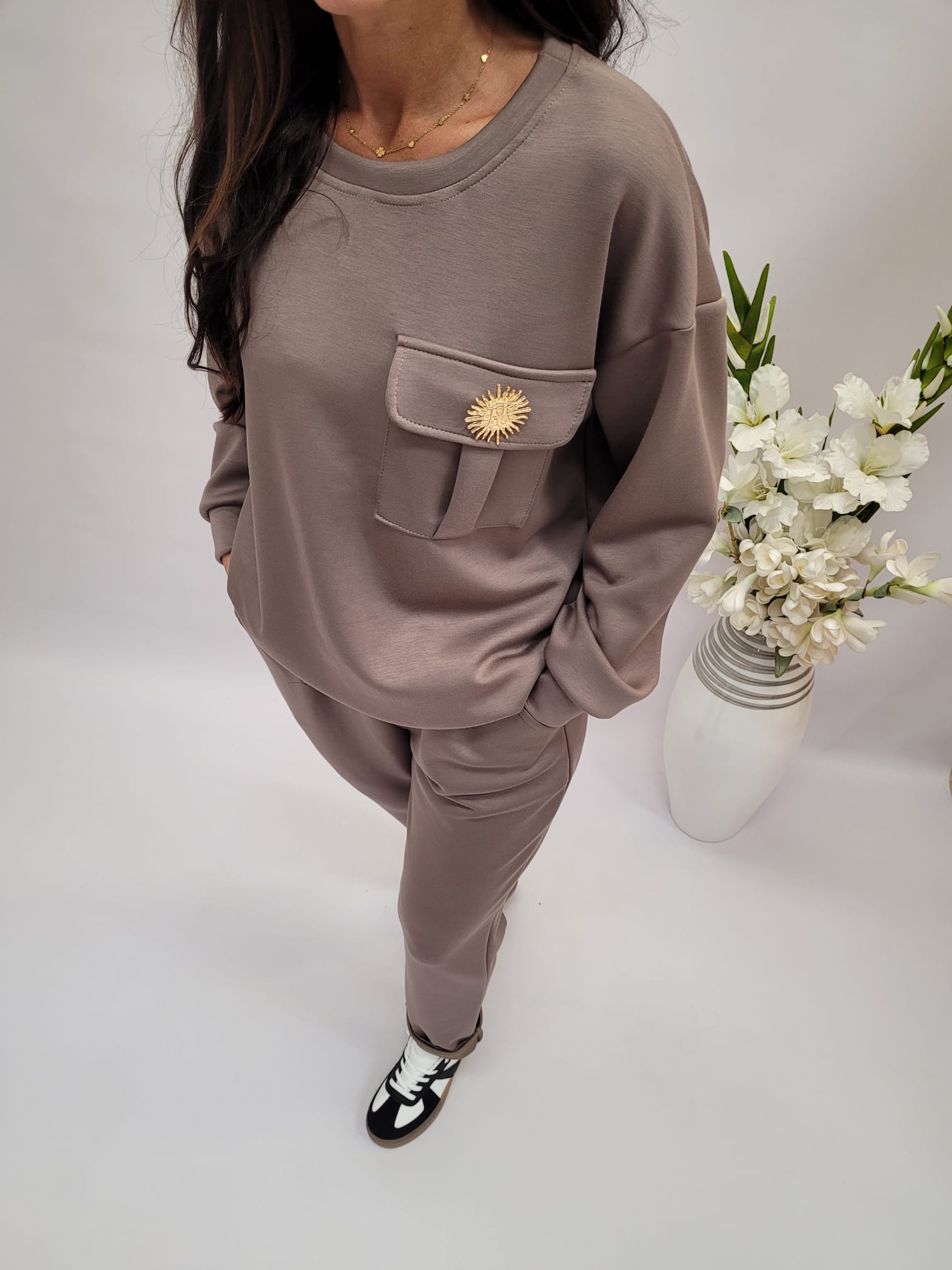Wygodny dres w ciepłych kolorach to idealne połączenie komfortu i stylu. Wykonany z miękkiego, przyjemnego w dotyku materiału otula ciało zapewniając swobodę ruchów przez cały dzień. Całość uzupełnia modna dopinka , która nadaje zestawowi uroku i subtelnej elegancji.