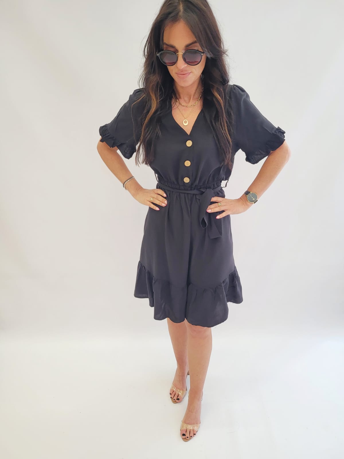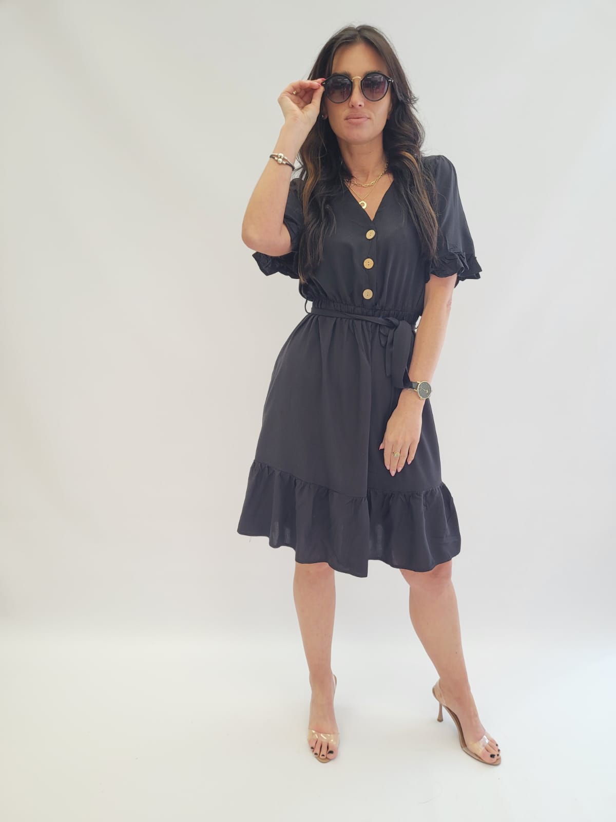 Krótka sukienka z falbankami ozdobiona 3 guzikami. Gumka w pasie i wiązany pasek pozwalają dopasować sukienkę do figury podkreślając talię.
