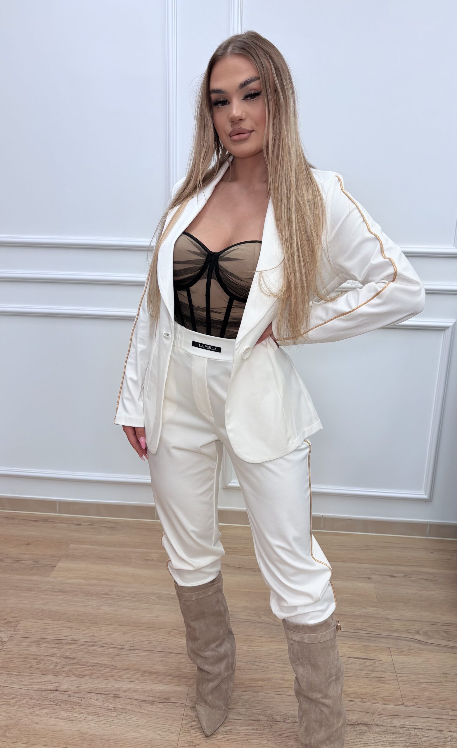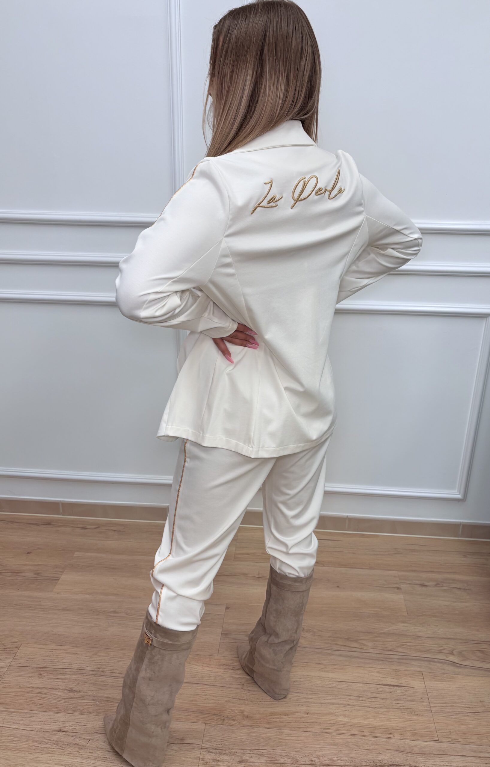 Marynarka o klasycznym kroju zapinana na jeden guzik, co nadaje lekkości i subtelnej elegancji. Rękawy zdobi delikatny, złoty lampas, który przełamuje klasyczny fason i dodaje całości nowoczesnego akcentu. Z tyłu znajduje się haftowane logo marki LA PERLA, podkreślające wyjątkowy charakter kompletu.