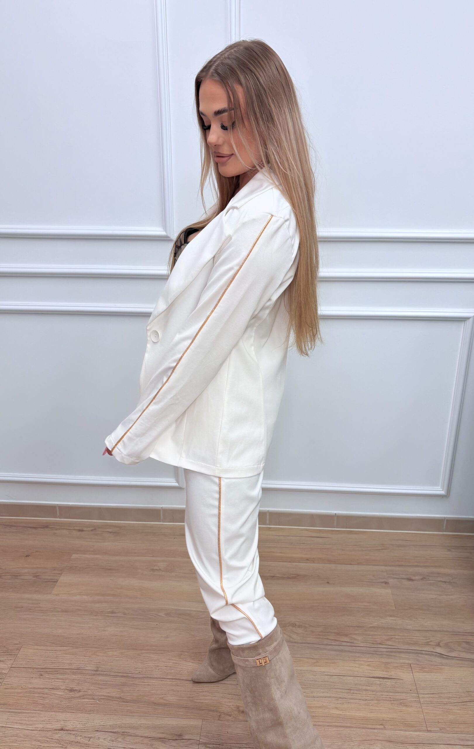 Spodnie z prostą nogawką zapewniają wygodę i swobodę ruchów. Wyposażone w praktyczne kieszenie oraz elastyczną gumę w pasie, doskonale dopasowują się do sylwetki. Całość dopełnia subtelny złoty lampas biegnący wzdłuż nogawki, harmonizujący z detalem w marynarce.