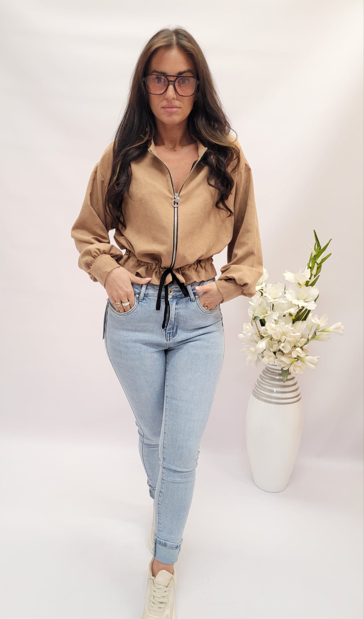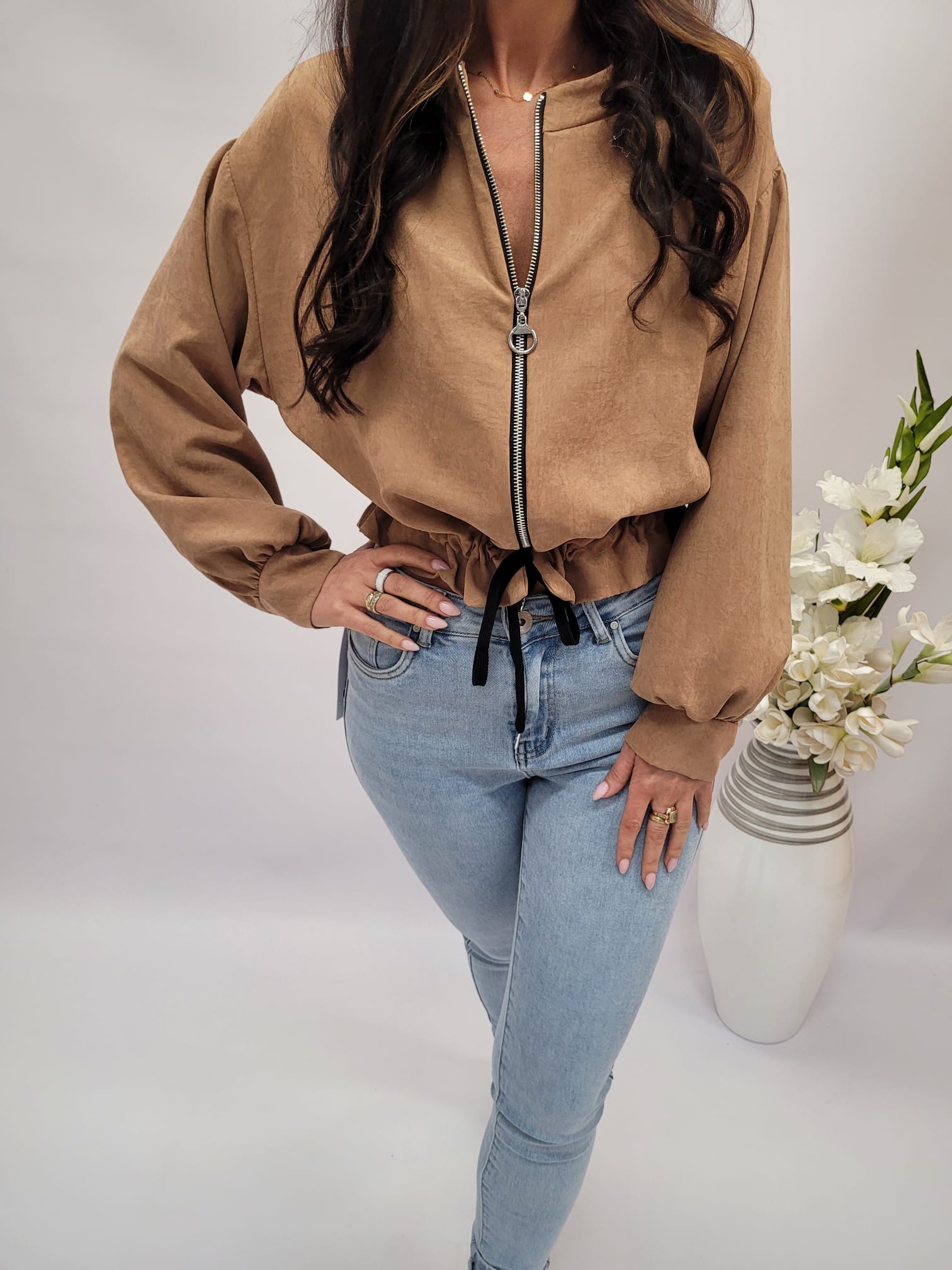 Krótka bluza na zamek wiązana brąz