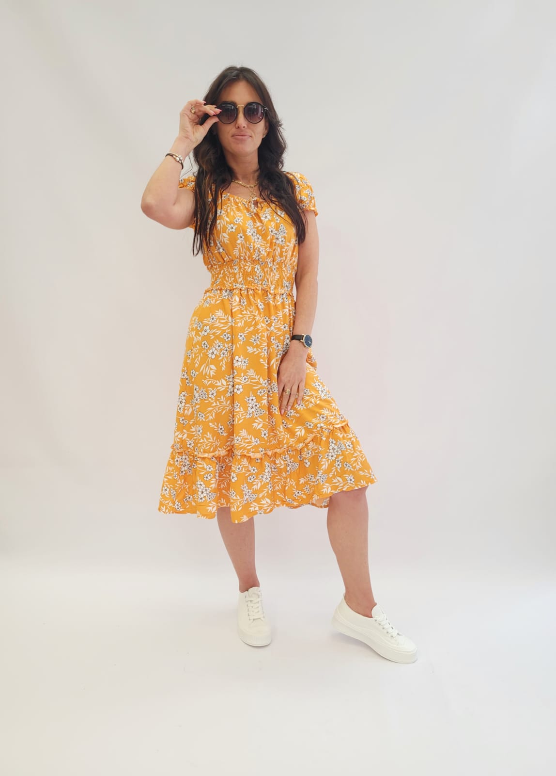 Krótka kwiecista sukienka z gumką w pasie pomarańczowa