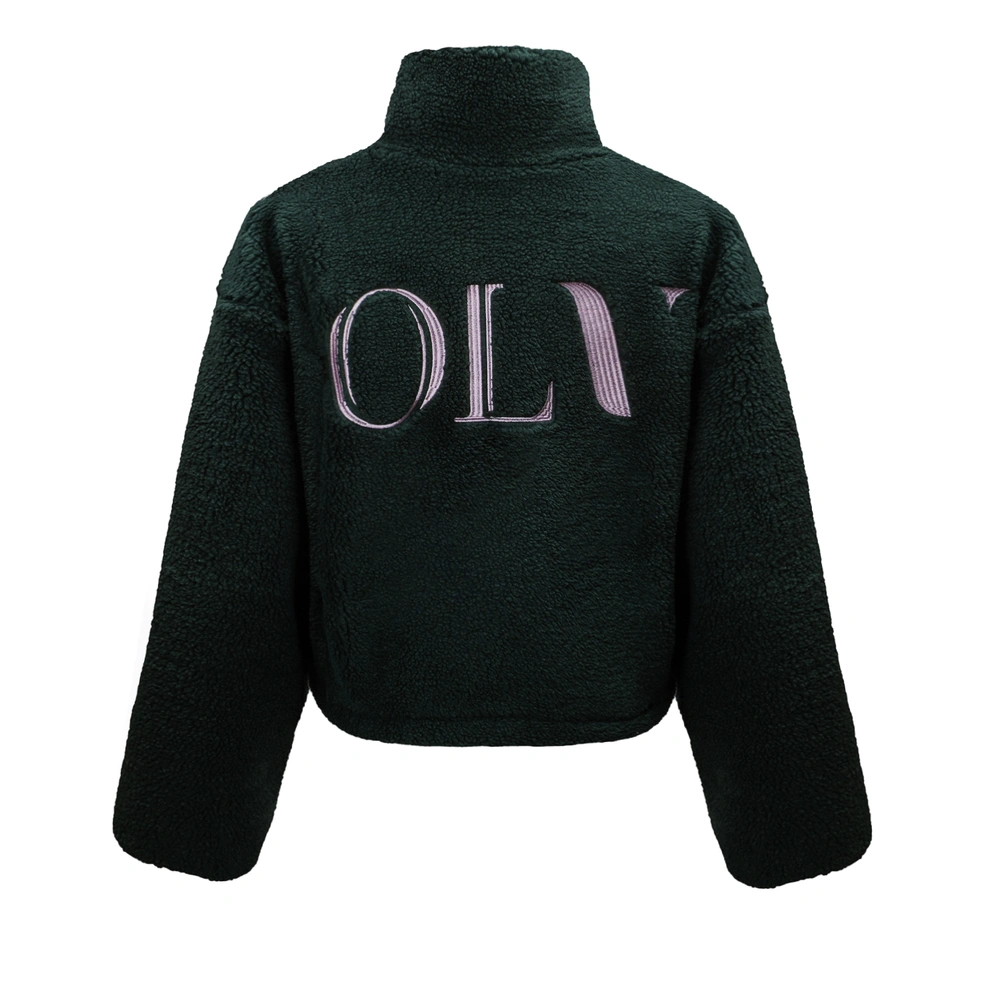 Casualowa kurtka, typu teddy z wysoką stójką, zapinana na zamek. Wykonana z miękkiego, przyjemnego w dotyku materiału o strukturze sherpa. Model o lekko krótszym kroju z obniżoną linią ramion. Po bokach praktyczne kieszenie. Na przodzie subtelny haft z logo marki OLAVOGA, natomiast na plecach efektowny, duży haft z inicjałami OLV.