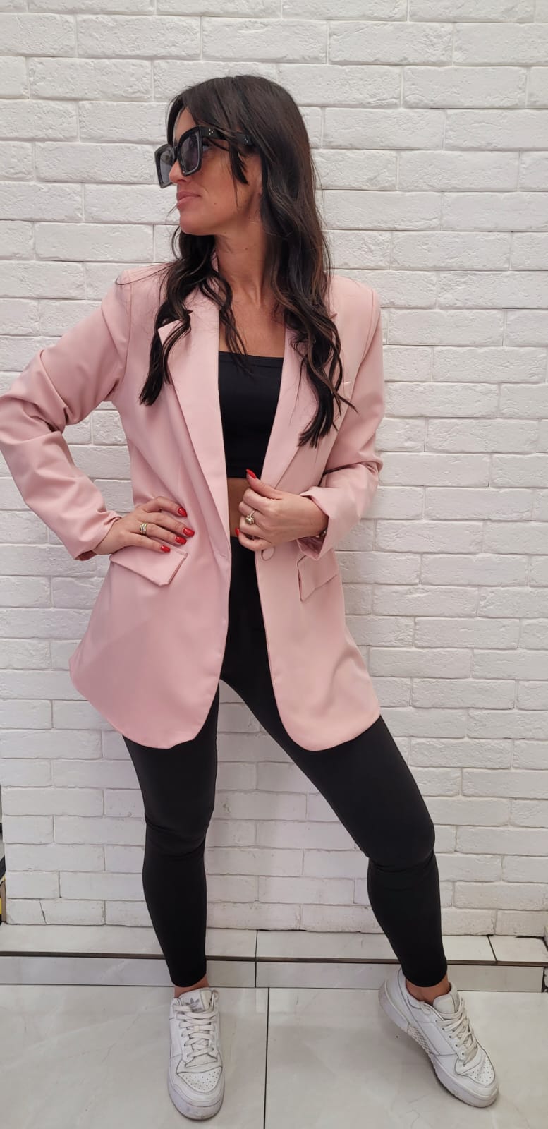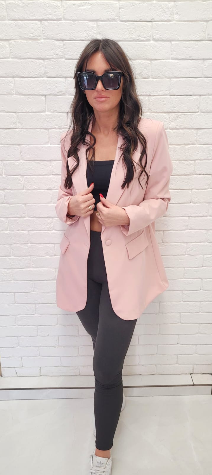 Luźna marynarka damska w kolorze różowym. Zapinana na jeden guzik, z kieszeniami i podszewką.