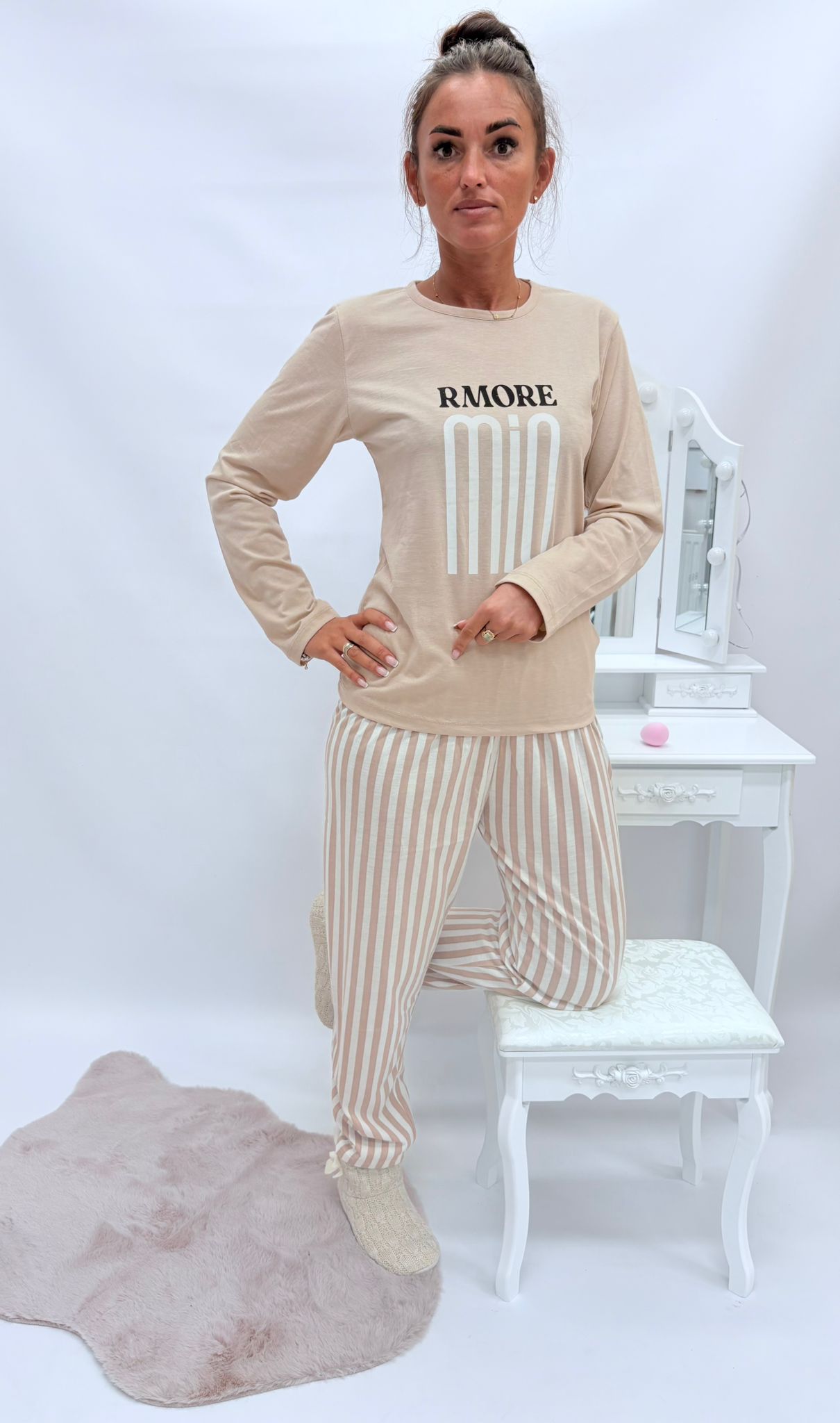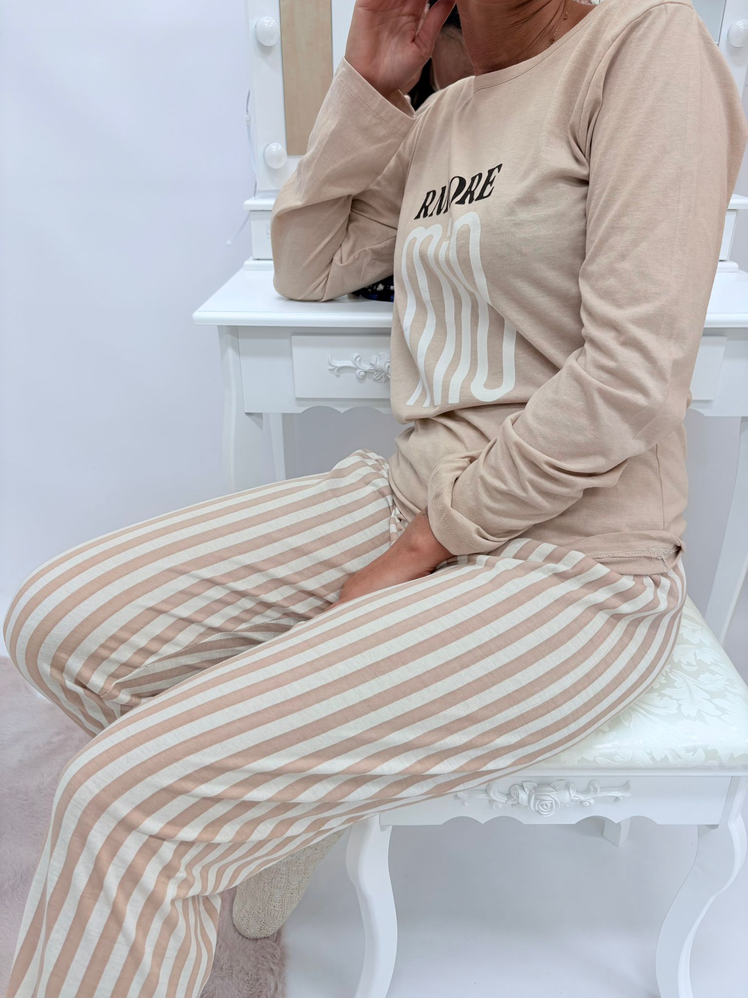 Piżama damska z długi rękawem wykonana z miękkiej i przyjemnej w dotyku tkaniny. Góra ozdobiona wzorem, spodnie z gumką w pasie. Wygodny komplet idealny na spokojny domowy relaks i sen.
