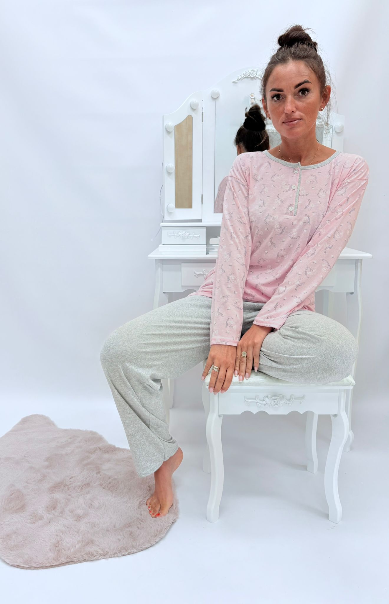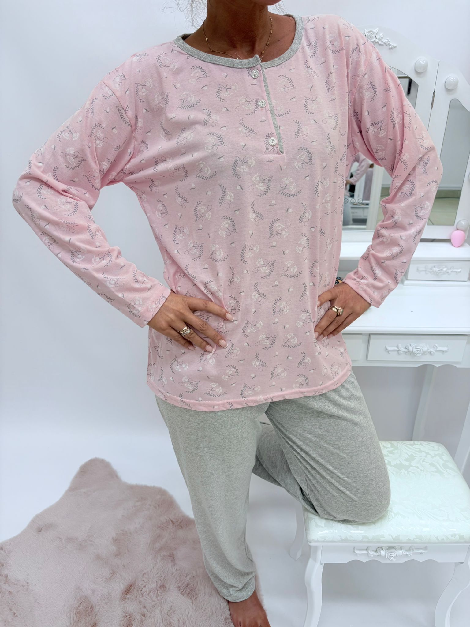 Stylowa i wygodna piżama uszyta z wysokiej jakości, miękkiego materiału. Klasyczny fason uzupełniony trzema ozdobnymi guzikami przy dekolcie, które dodają jej subtelnego uroku. Idealna na chłodniejsze noce, zapewnia komfort i elegancki wygląd.