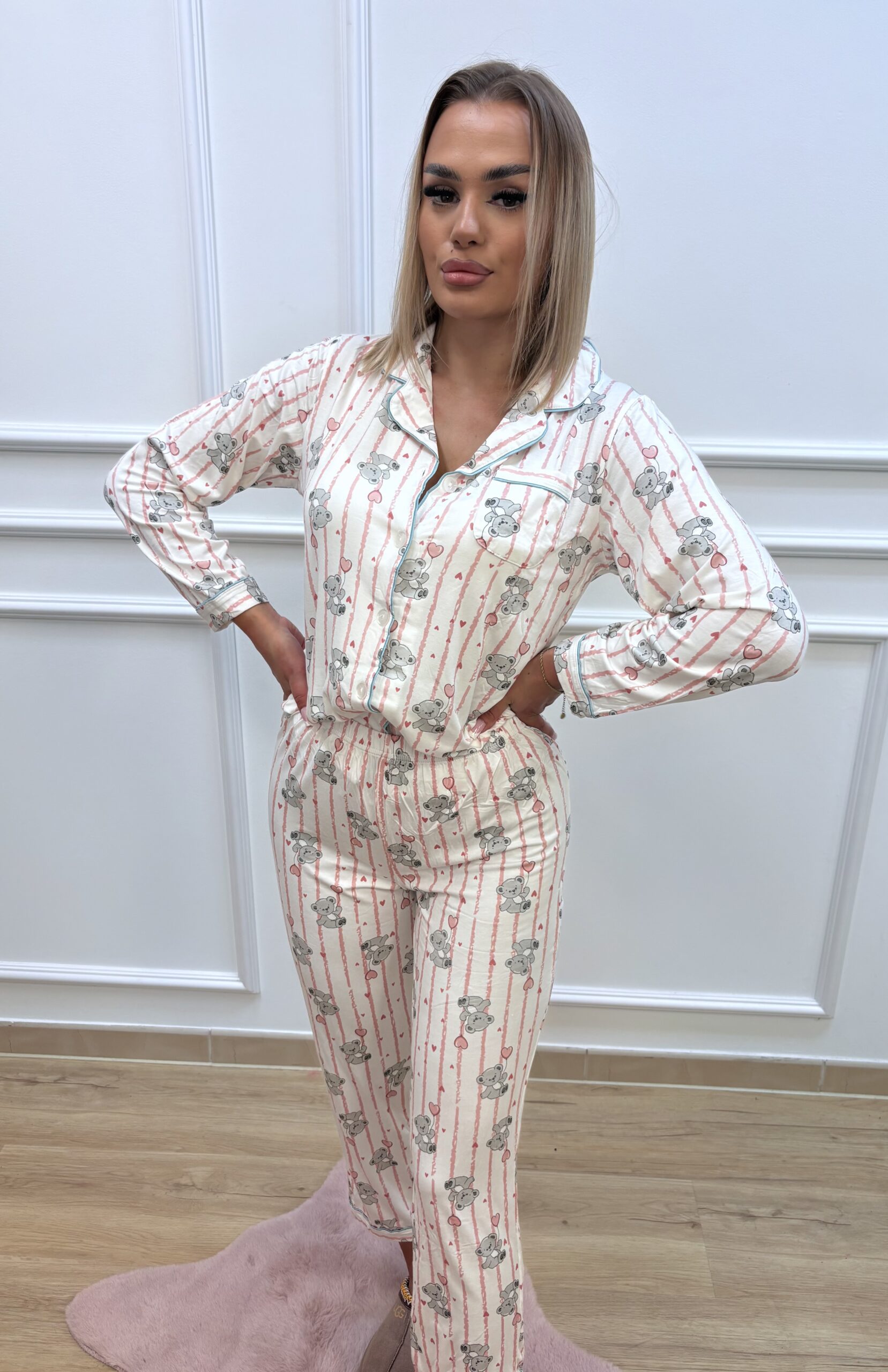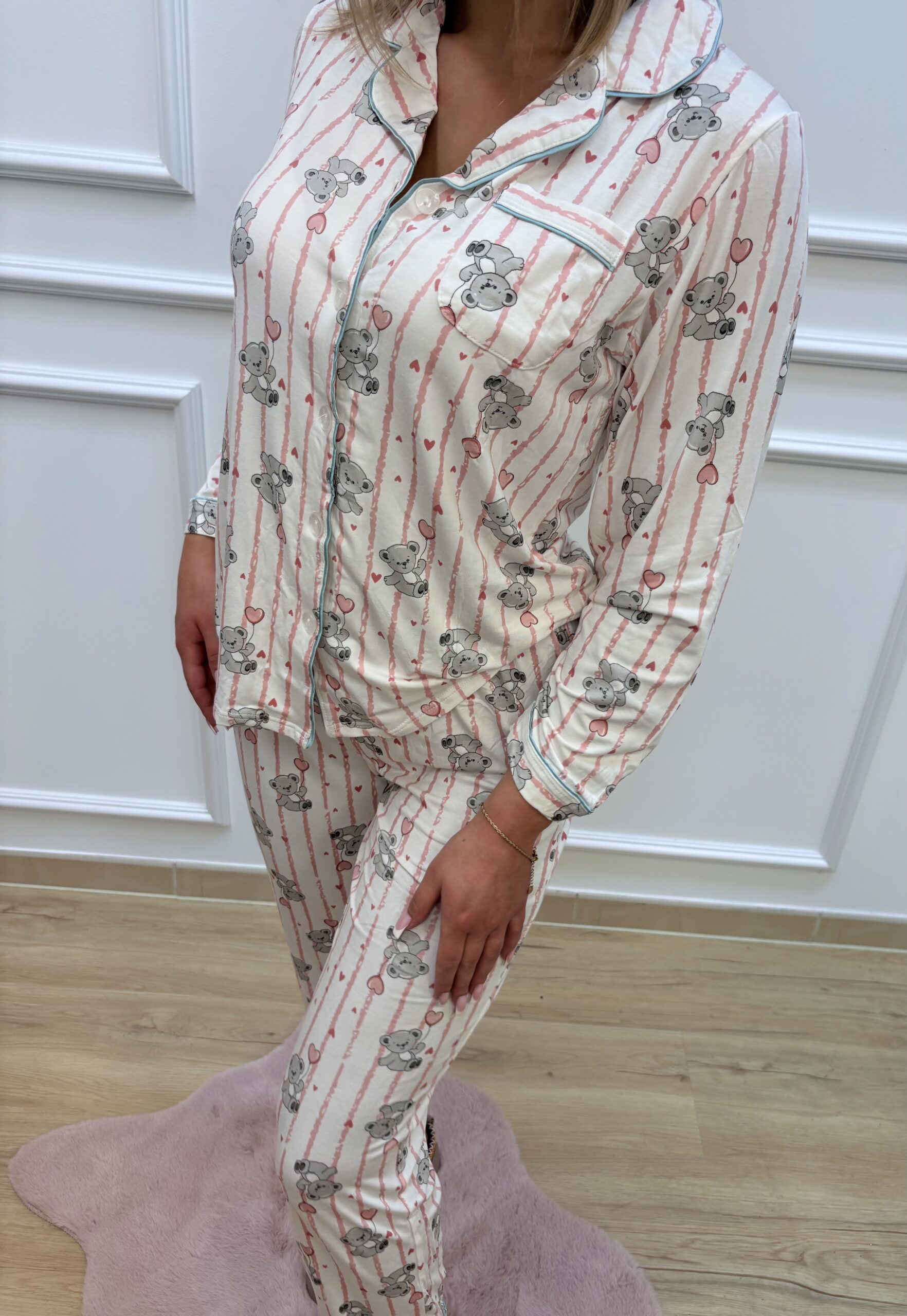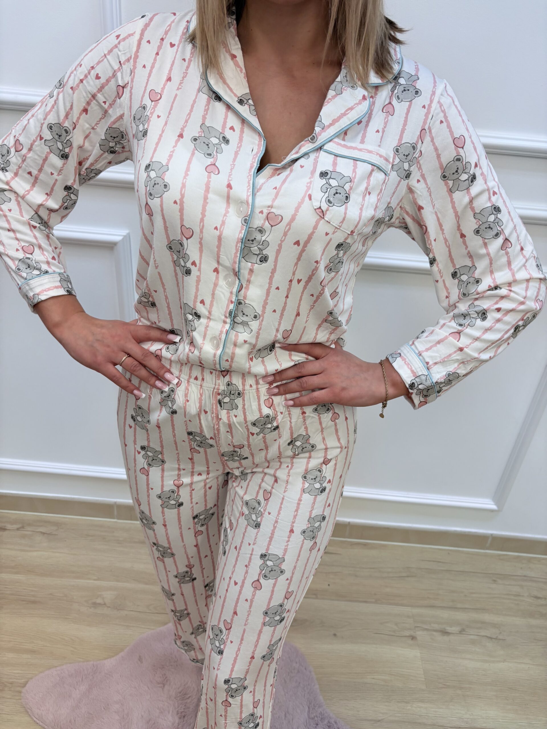 Wygodna i stylowa piżama damska wykonana z lekkiej, przyjemnej w dotyku tkaniny. Model w klasycznym, koszulowym kroju zapinanym na guziki gwarantuje pełen komfort oraz swobodę ruchów. Delikatny wzór przedstawiający słodkie misie trzymające serduszka nadaje piżamie uroku. sprawiając, że to idealny wybór dla miłośniczek subtelnych, dziewczęcych wzorów.