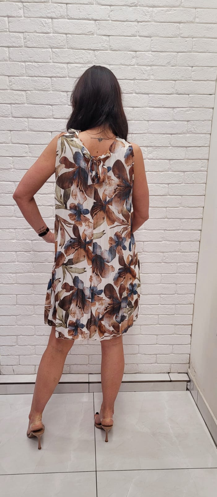 Plisowana sukienka na podszewce. Bez rękawów, wiązana na plecach w kwiecisty wzór.