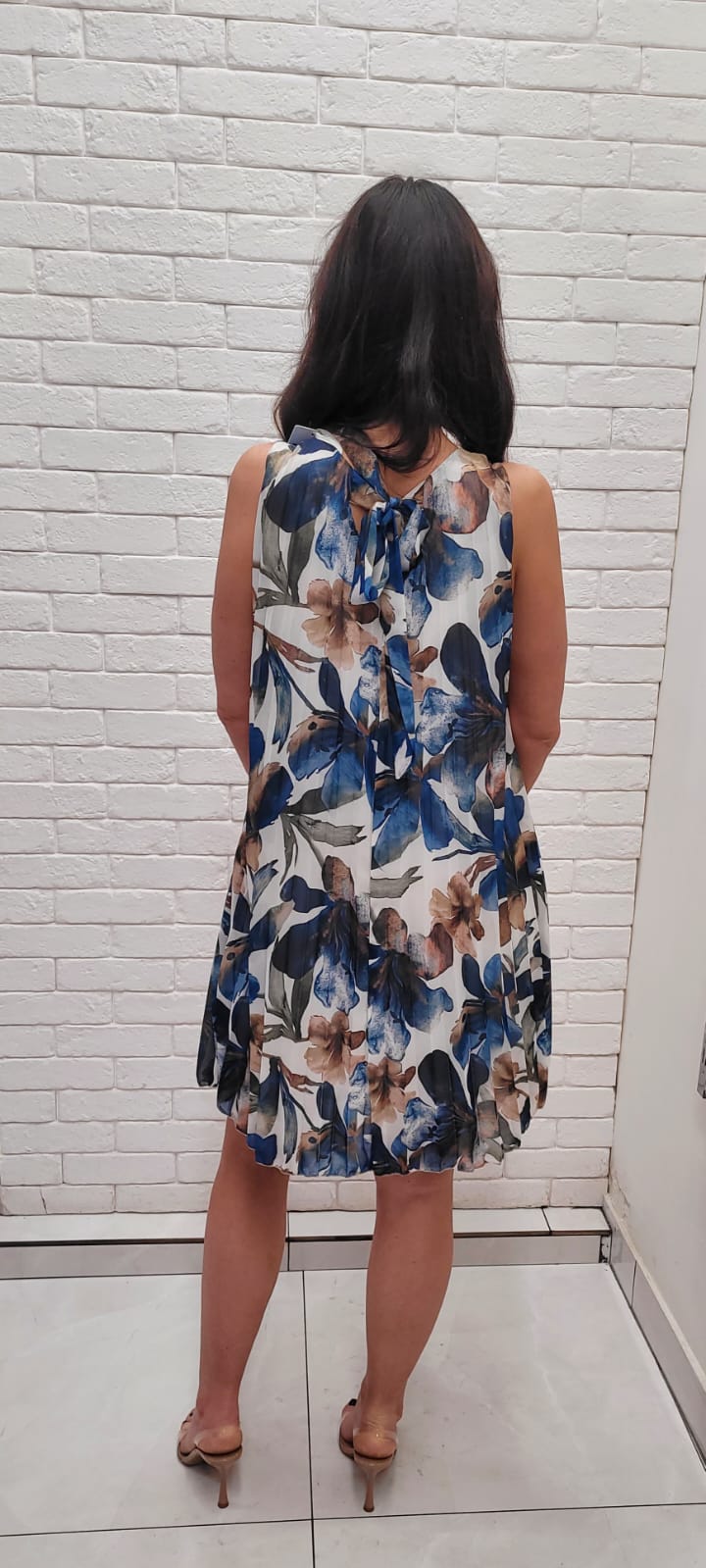 Plisowana sukienka na podszewce. Bez rękawów, wiązana na plecach w kwiecisty wzór.