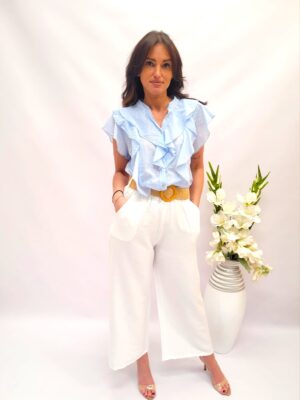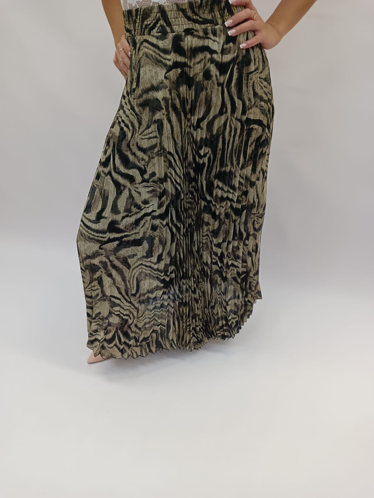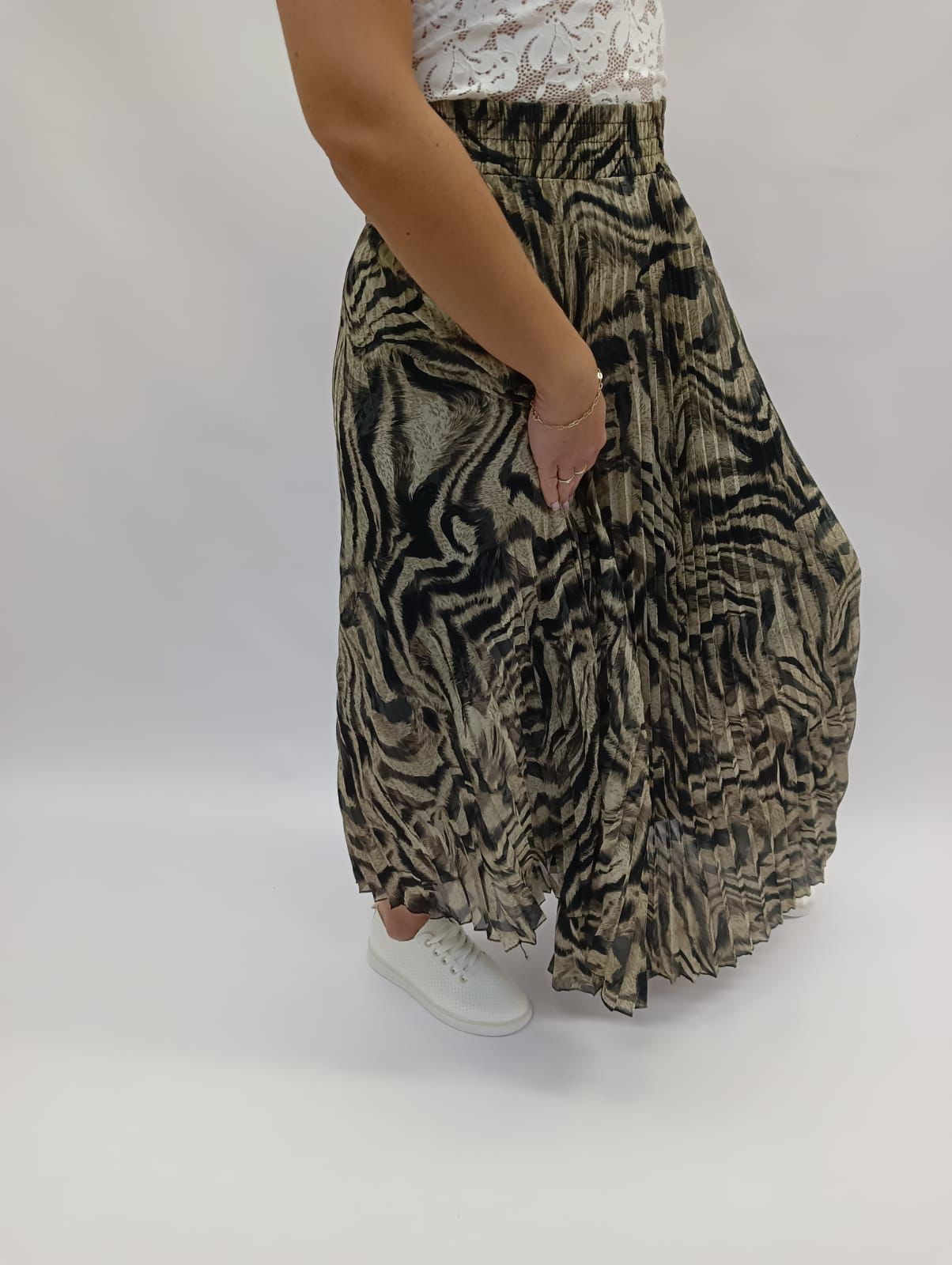 Ta lekka zwiewna spódnica plisowana to idealny wybór na ciepłe, słoneczne dni. Wykonana z przewiewnego materiału, delikatnie opływa sylwetkę, zapewniając komfort i swobodę ruchów. Klasyczne plisy i delikatny wzór dodają jej elegancji i subtelnego uroku.