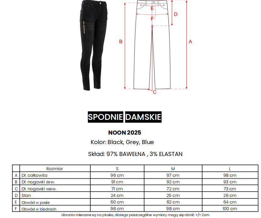 Casualowe spodnie, typu denim, z wysokim stanem. Wykonane z wysokiej jakości elastycznej bawełny. Na udzie złote logo marki OLAVOGA. Z tyłu skórzana, logowana naszywka. Nogawki zwężane ku dołowi.