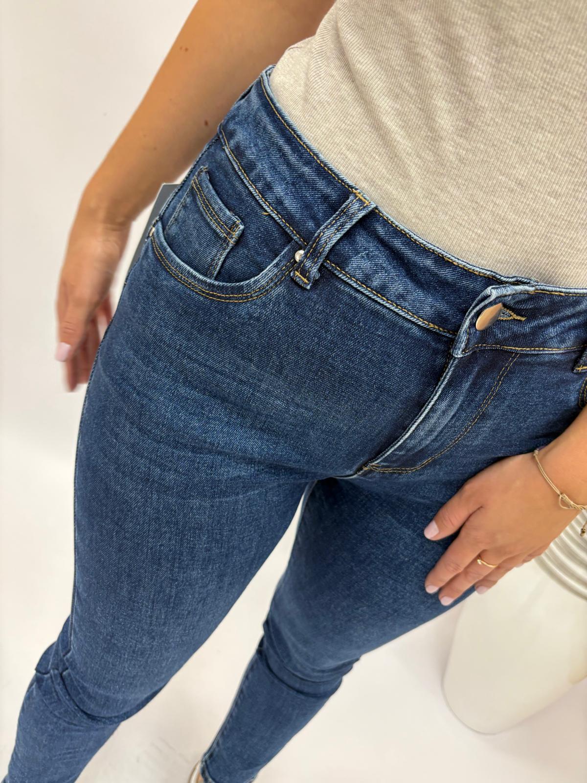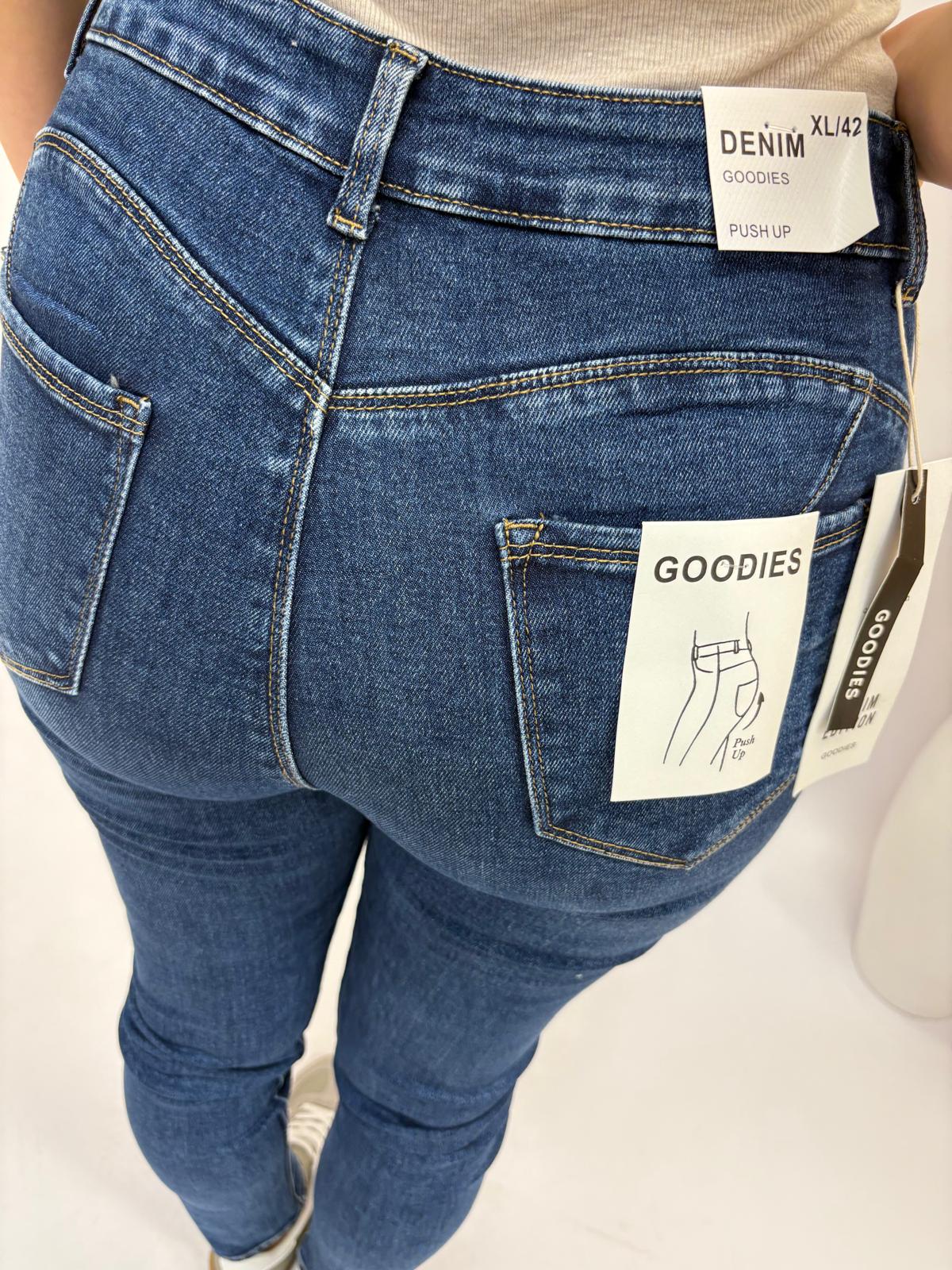 Klasyczne, dopasowane jeansy o kroju typu skinny, zaprojektowane tak, aby subtelnie podkreślać kształty. Dzięki specjalnym przeszyciom i krojowi push up spodnie unoszą i uwydatniają pośladki, jednocześnie wysmuklając nogi. Wąska nogawka pięknie dopasowuje się do ciała, a elastyczny materiał zapewnia wygodę noszenia przez cały dzień.
