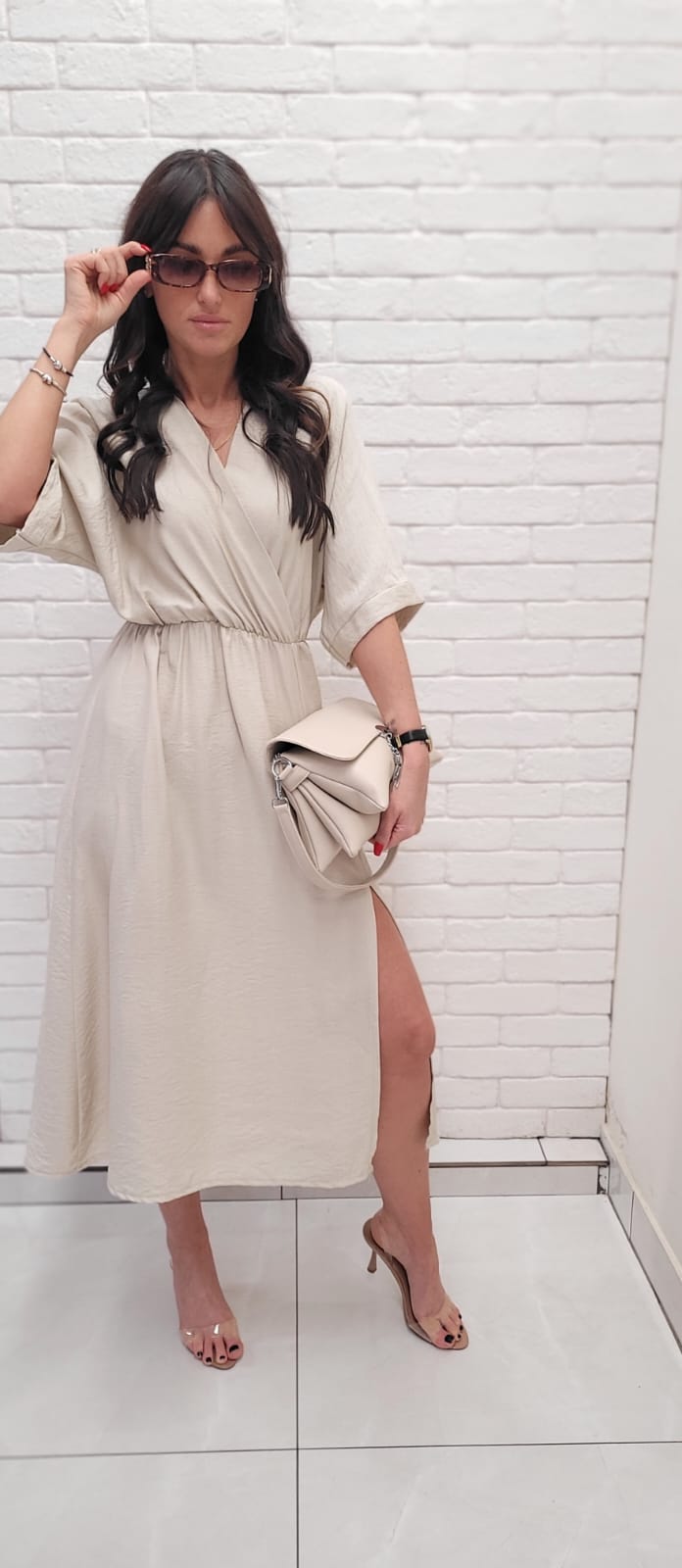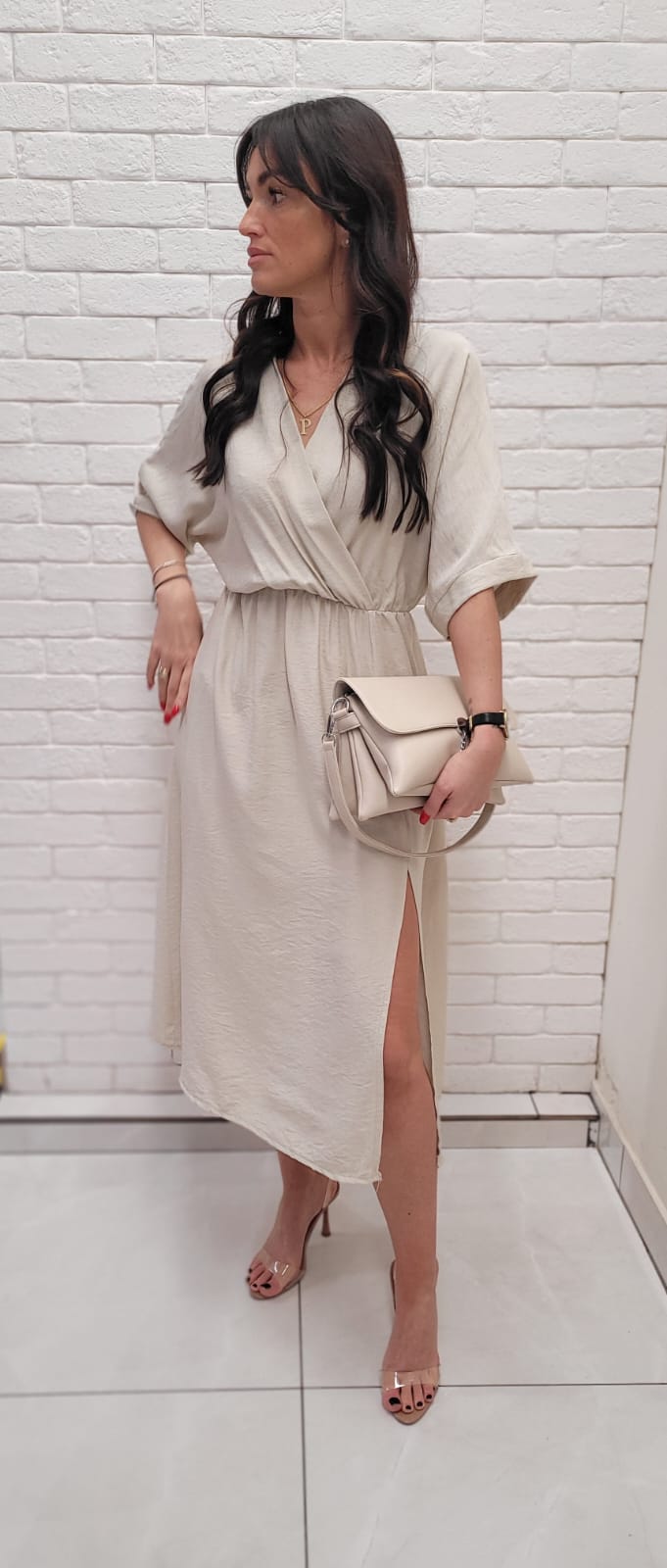Kopertowa długa sukienka z gumką w pasie i dolnym rozcięciem.