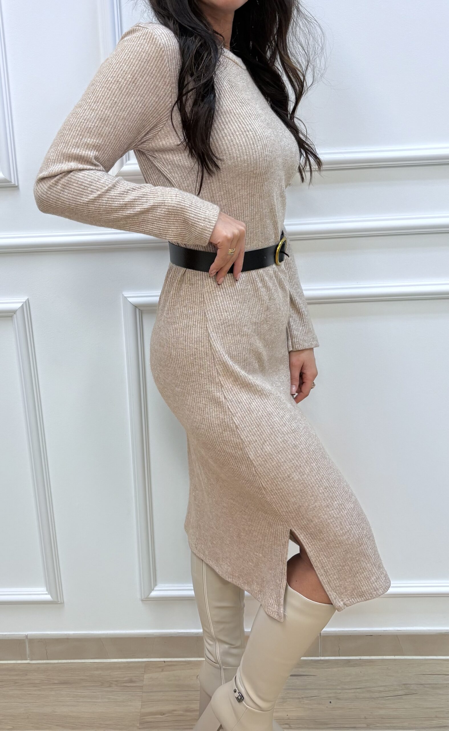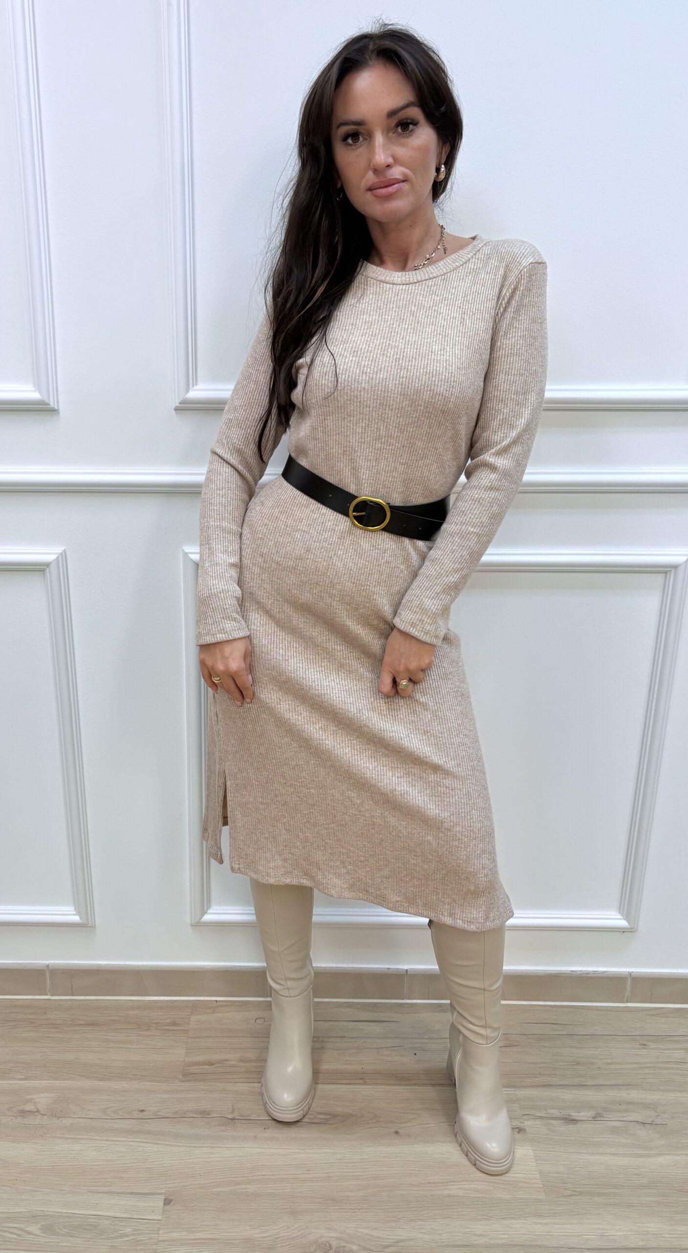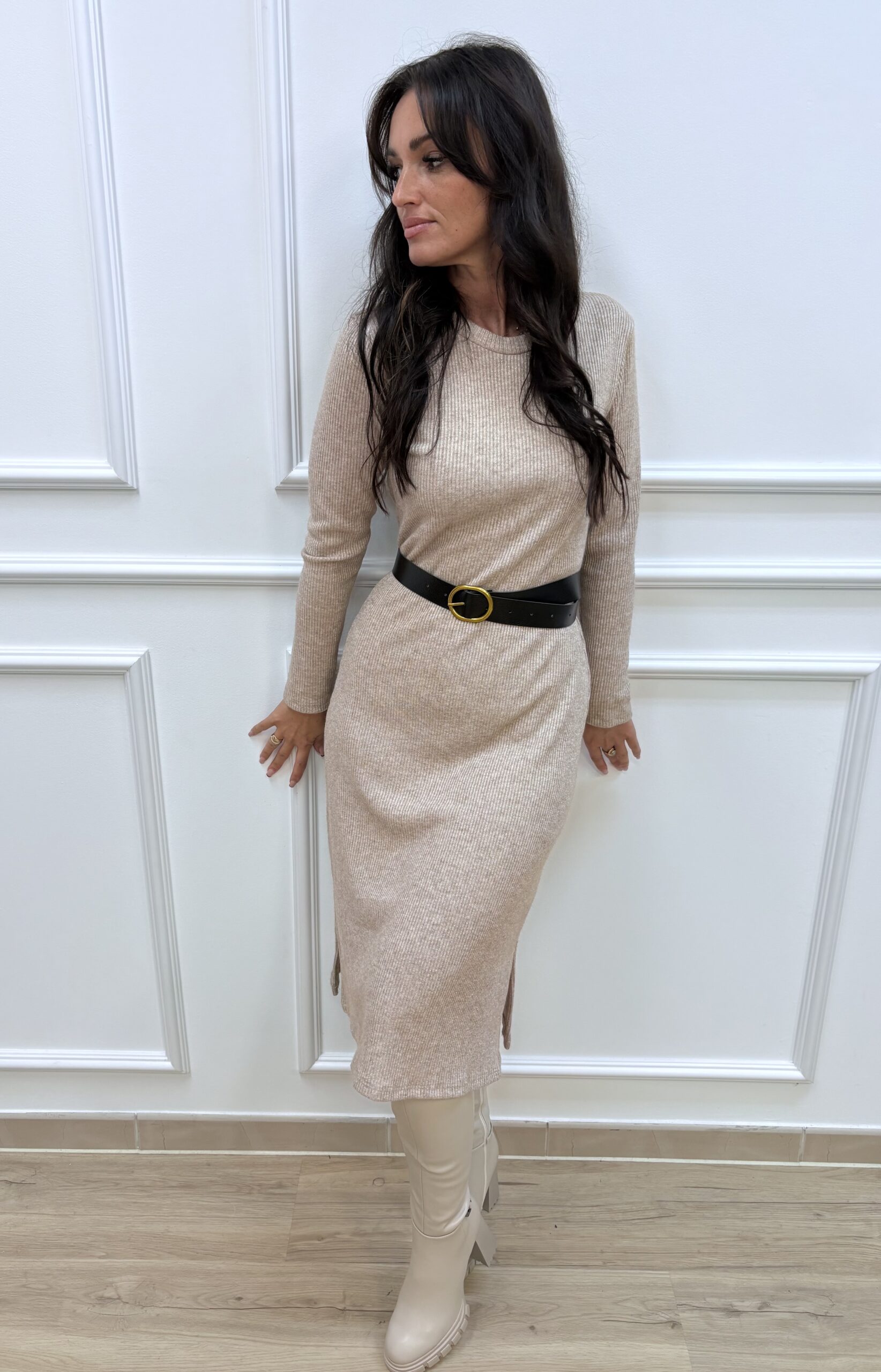 Dzianinowa sukienka z prążka to połączenie komfortu, stylu i subtelnego blasku. Delikatna srebrna nitka dodaje jej elegancji. W zestawie znajduje się dopasowany pasek, który pięknie podkreśla talię i pozwala dopasować fason do sylwetki.