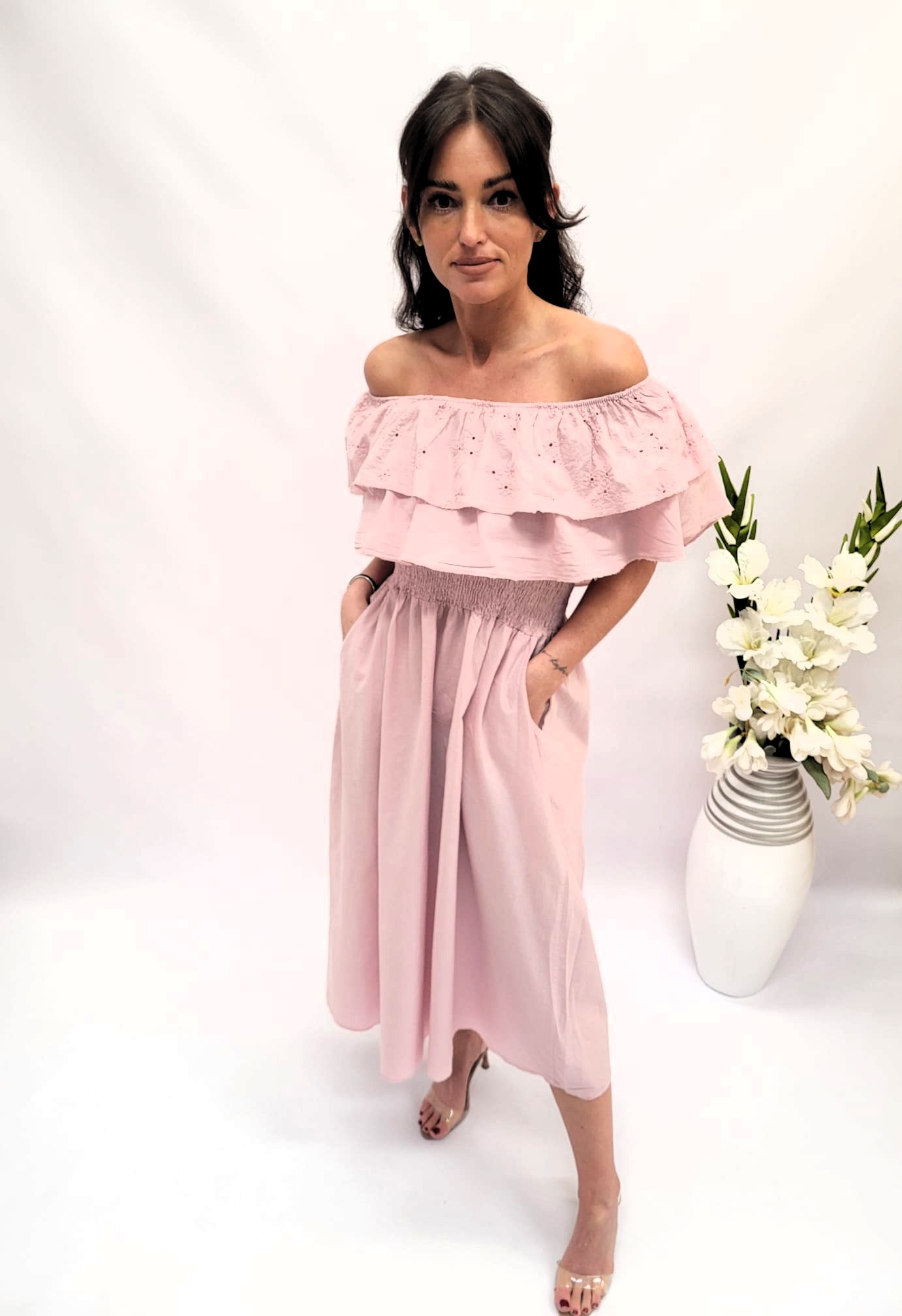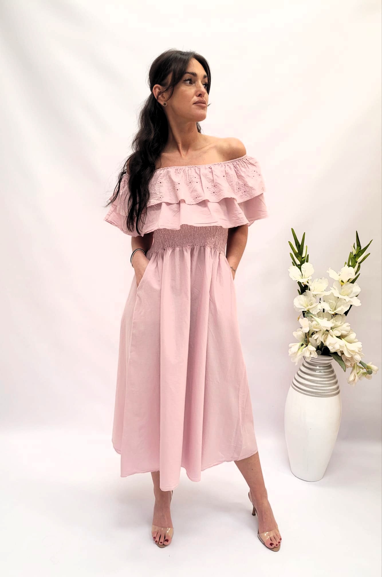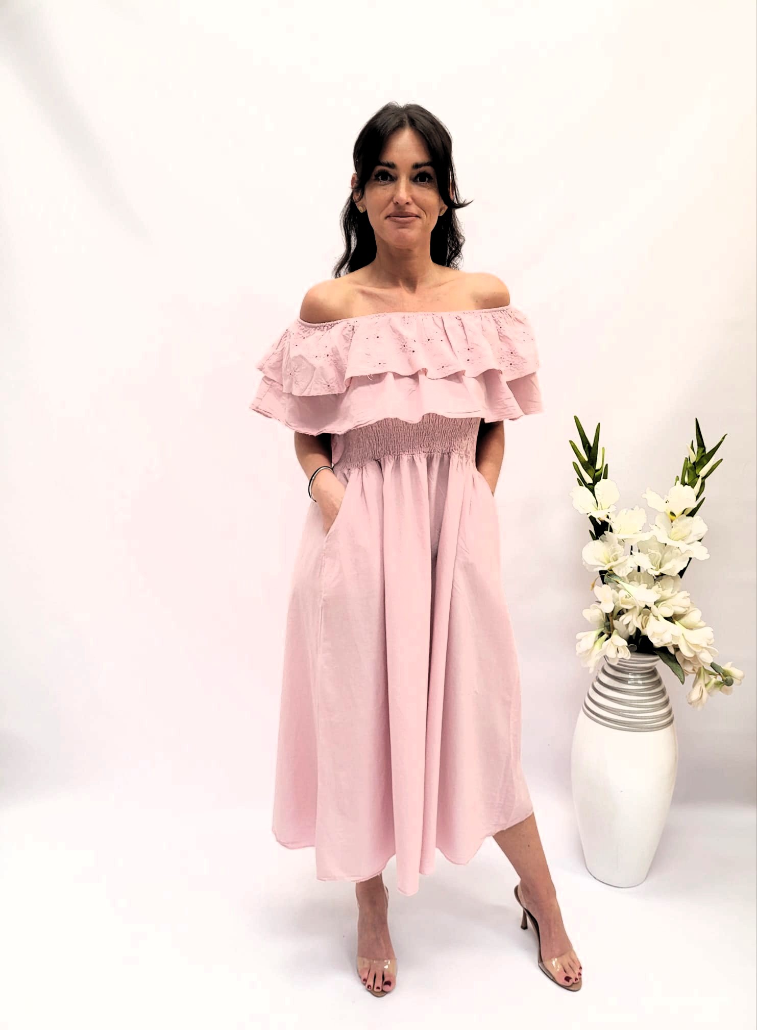 Podkreśl swoją kobiecość dzięki wyjątkowej hiszpance o długości maksi. Charakterystyczny dekolt typu carmen subtelnie odsłania ramiona dodając sylwetce lekkości i romantyzmu. Zmysłowa elegancja w śródziemnomorskim stylu.