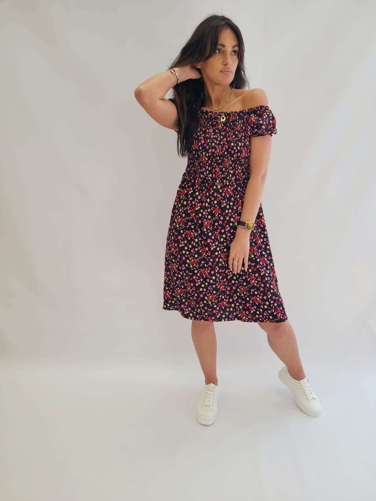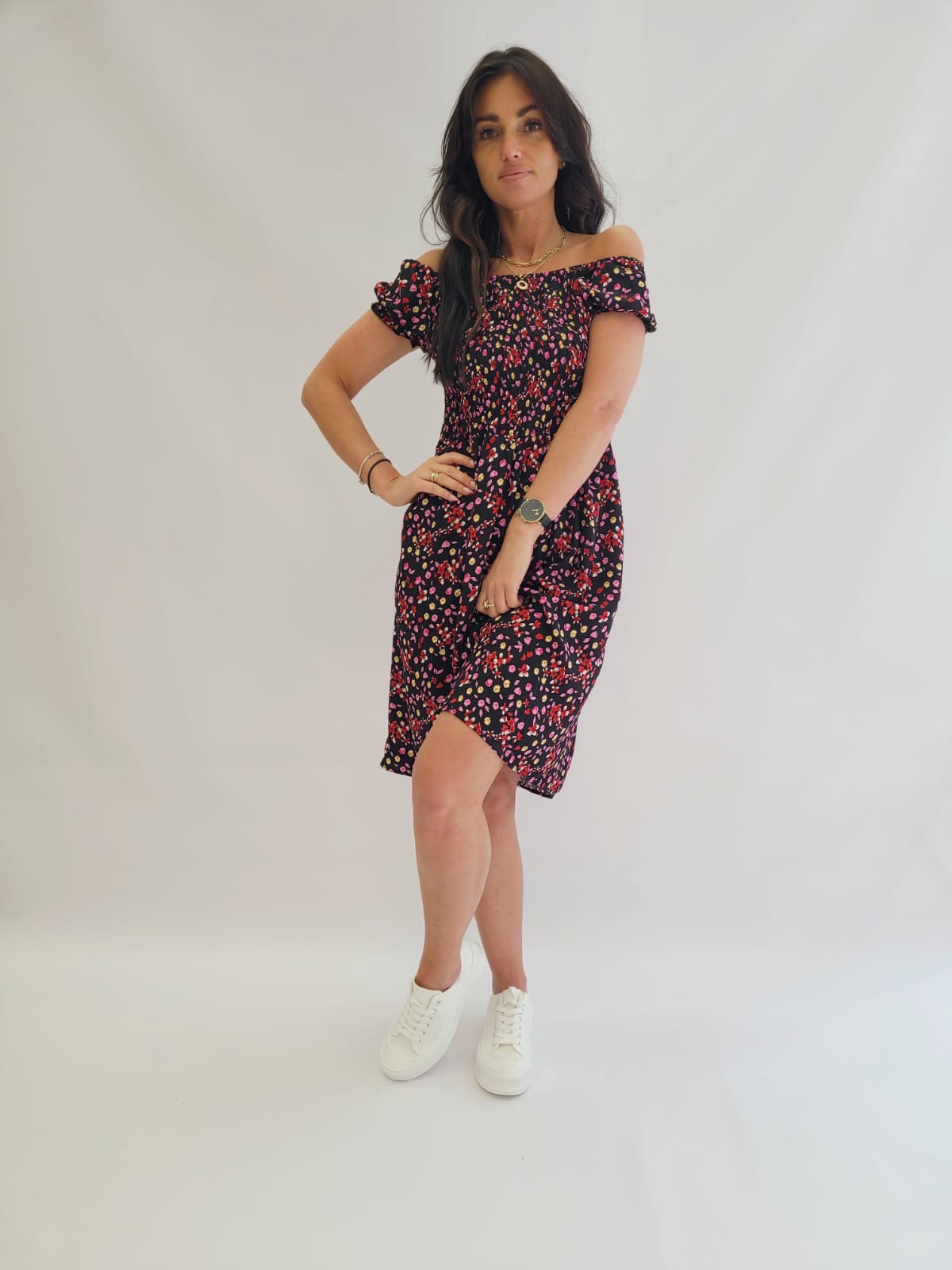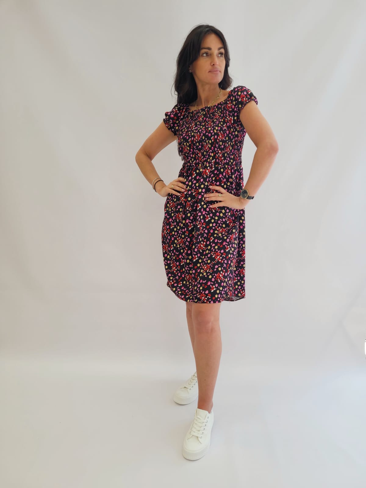 Sukienka krótka z gumką w pasie czarna w drobne kwiatki