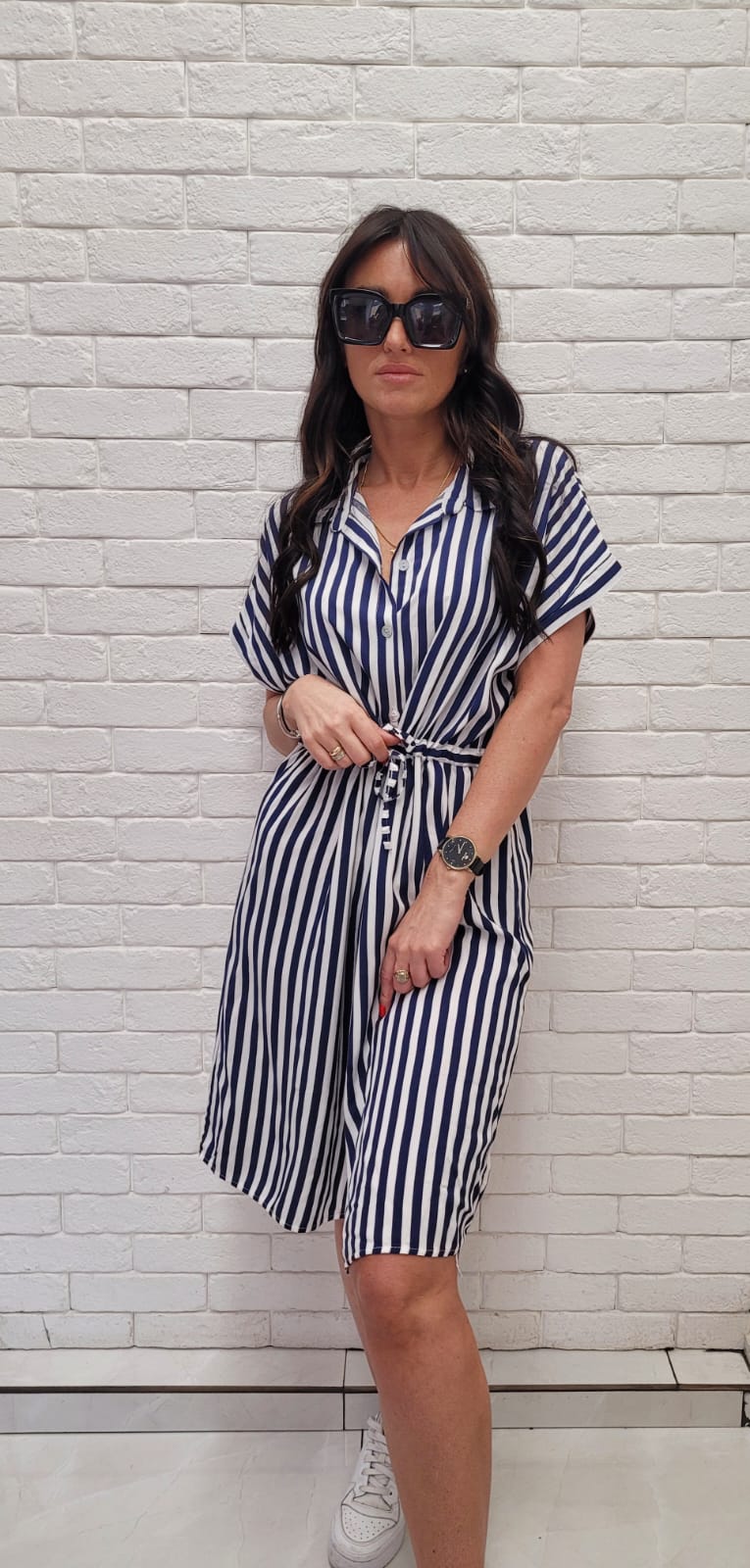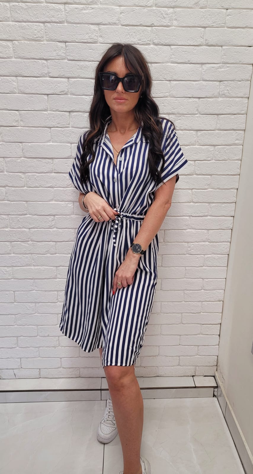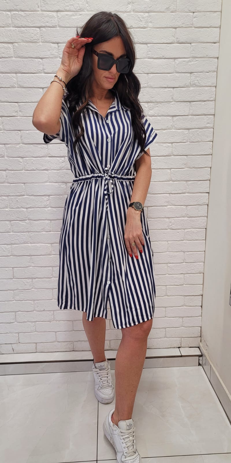 Rozpinana sukienka z kołnierzykiem i  wiązaniem w pasie. Wzór w niebieskie paski.