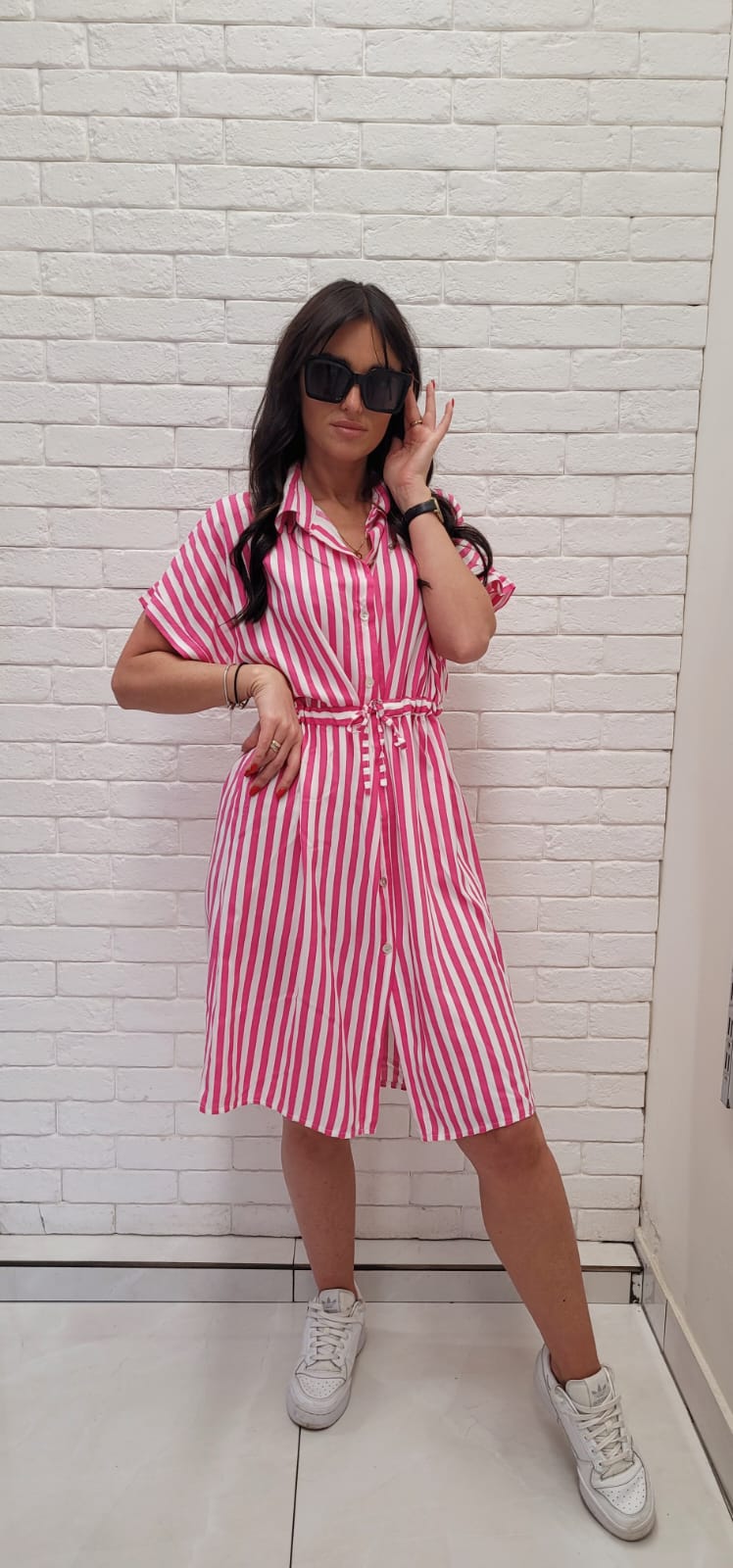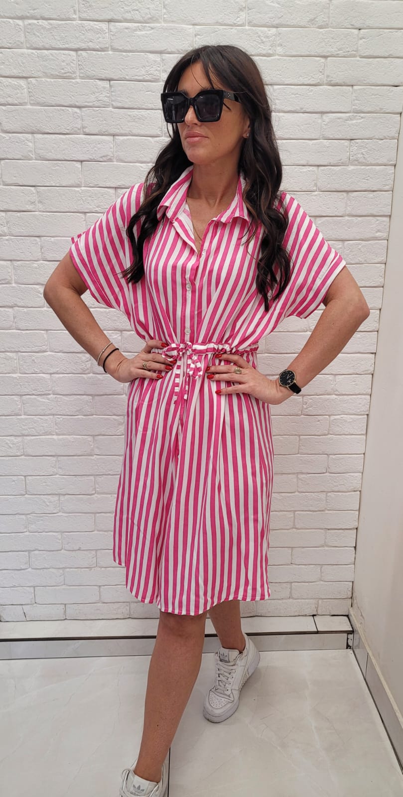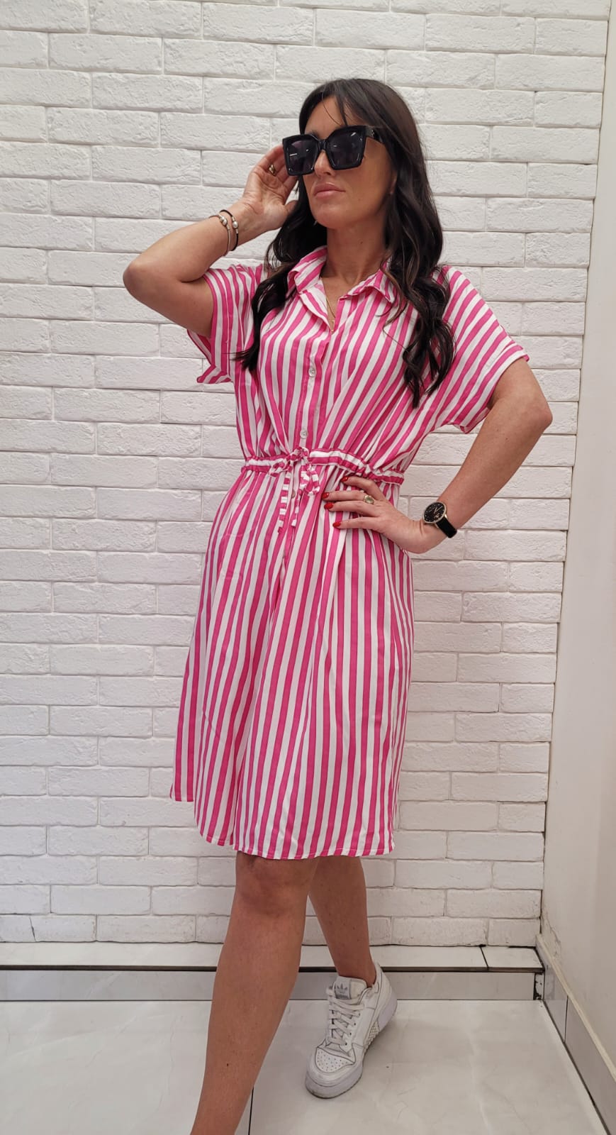Rozpinana sukienka z kołnierzykiem i wiązana w pasie. Wzór w różowe pasy.