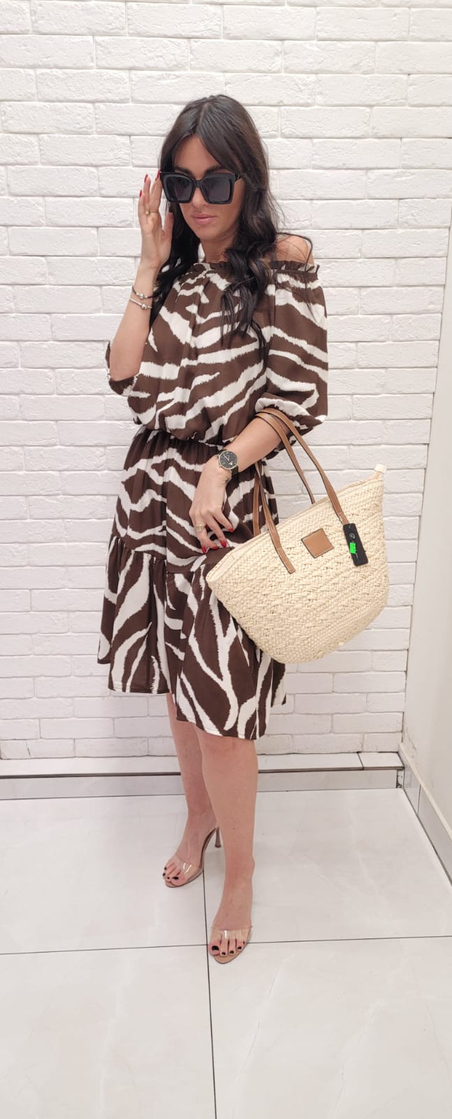 Sukienka z falbanami i hiszpańskim dekoltem i gumką w pasie.