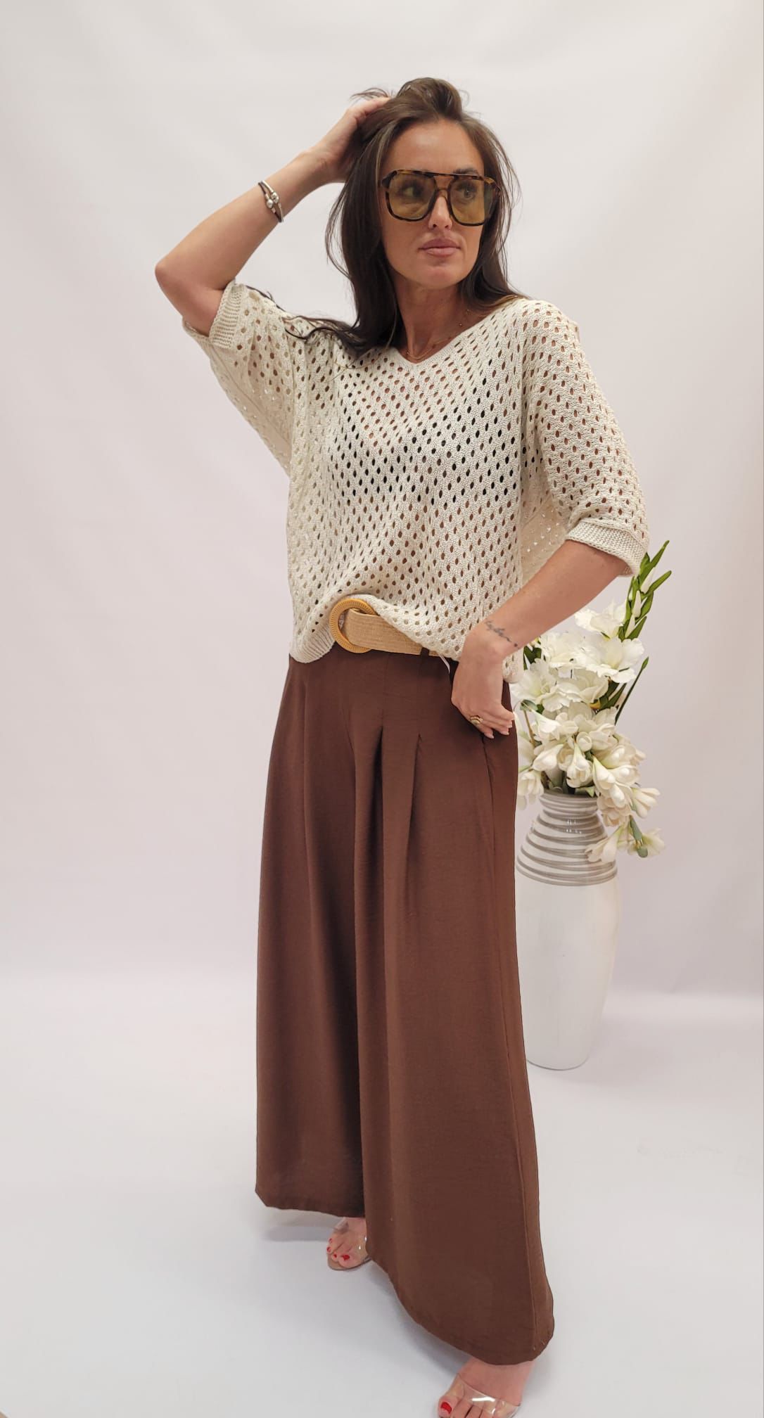 Lekki sweterek idealny na wieczór. Ażurowy splot dodaje mu romantycznego charakteru, a neutralny kolor sprawia że łatwo go dopasować do każdej stylizacji.