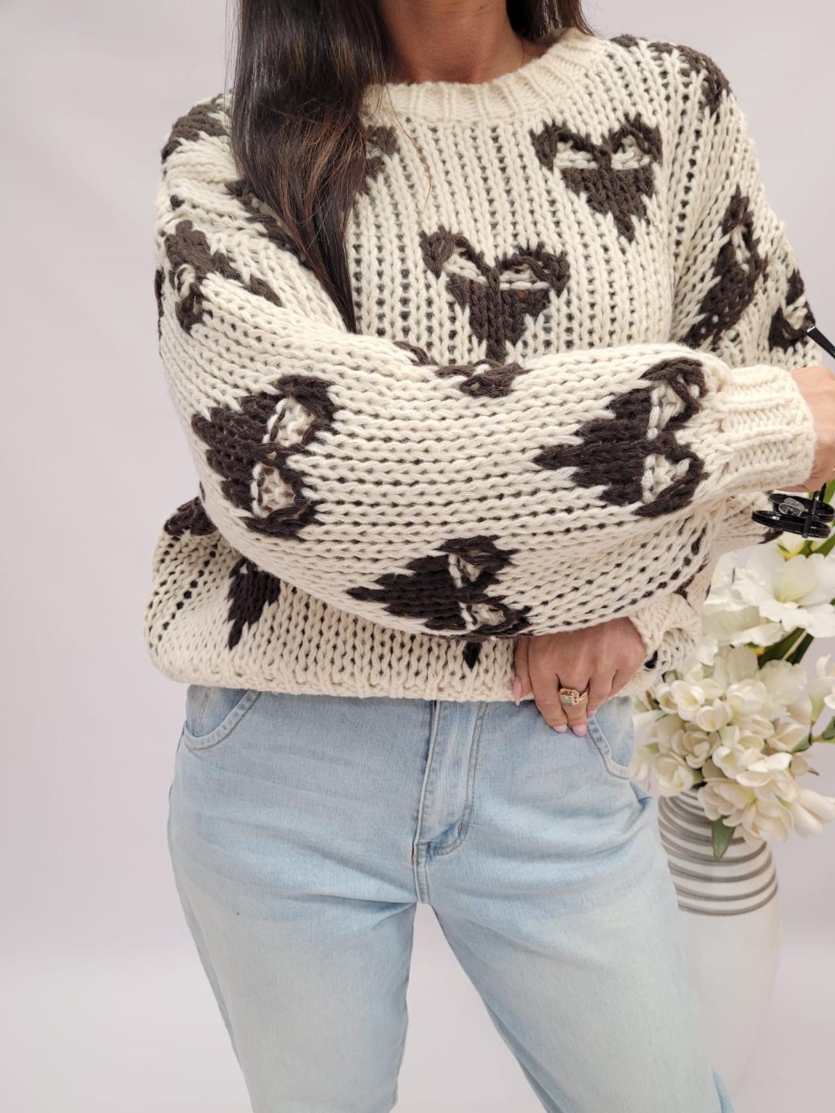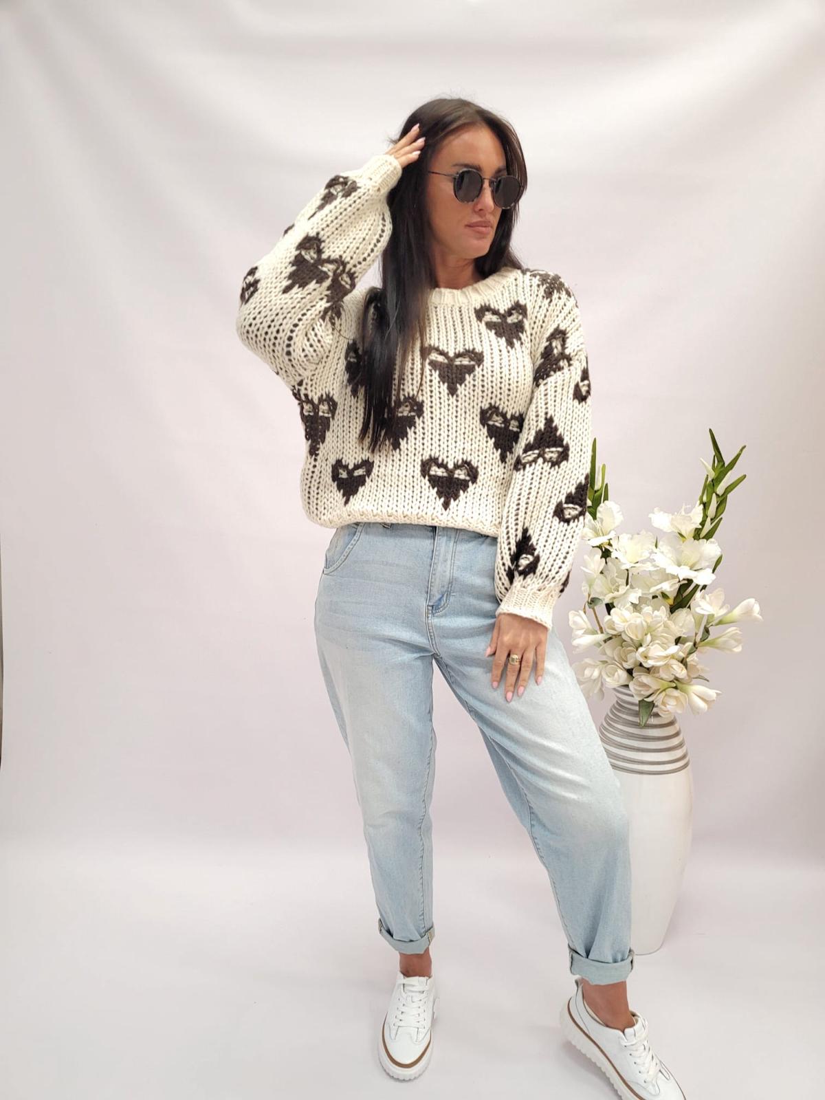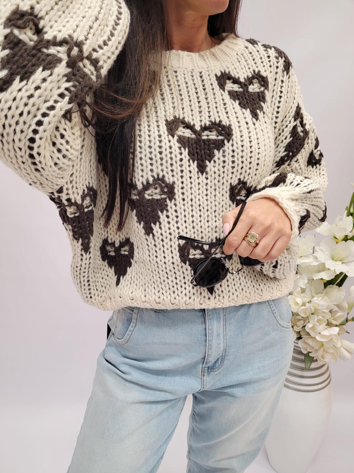 Gruby sweter z ozdobnymi sercami to ciepły otulający model idealny na chłodne dni. Wykonany z miękkiej, przyjemnej w dotyku dzianiny zapewnia komfort i ochronę przed zimnem. Ozdobny motywem serca nadaje mu kobiecy, romantyczny charakter.