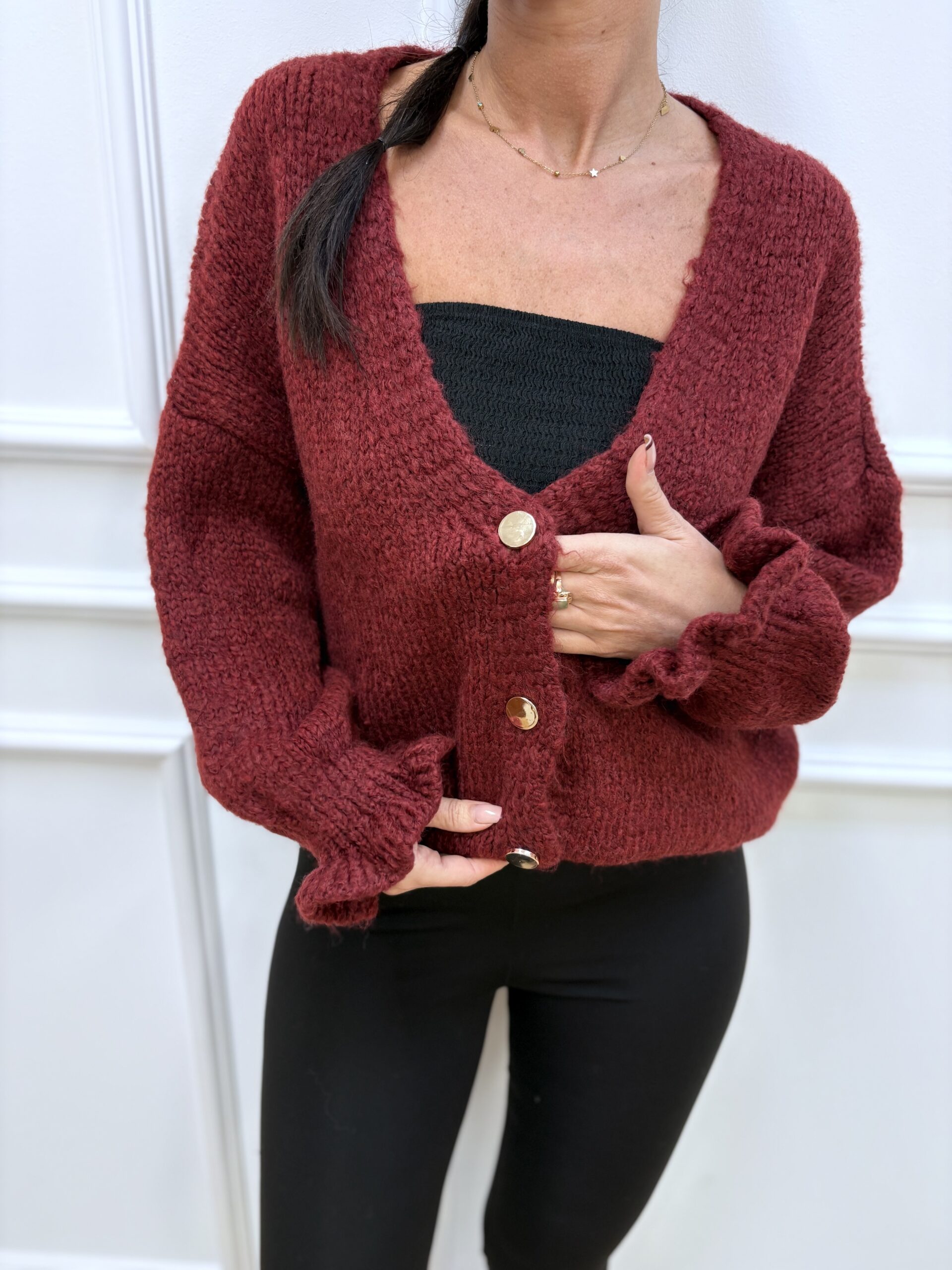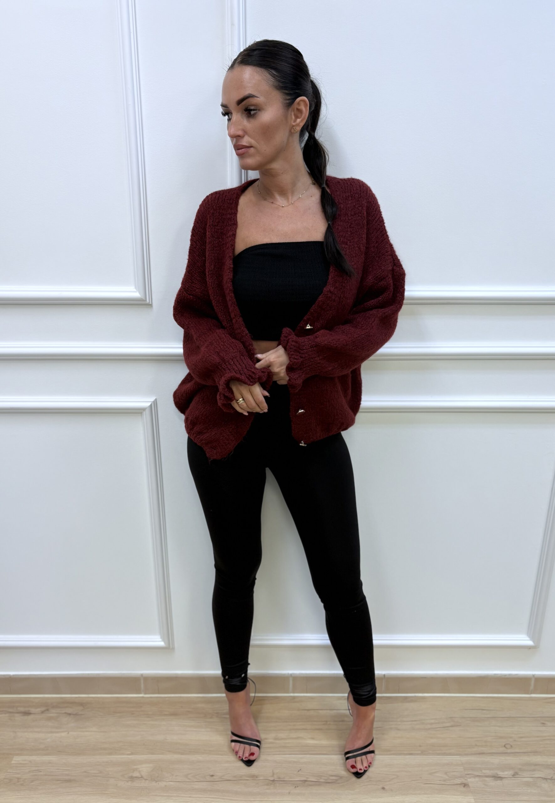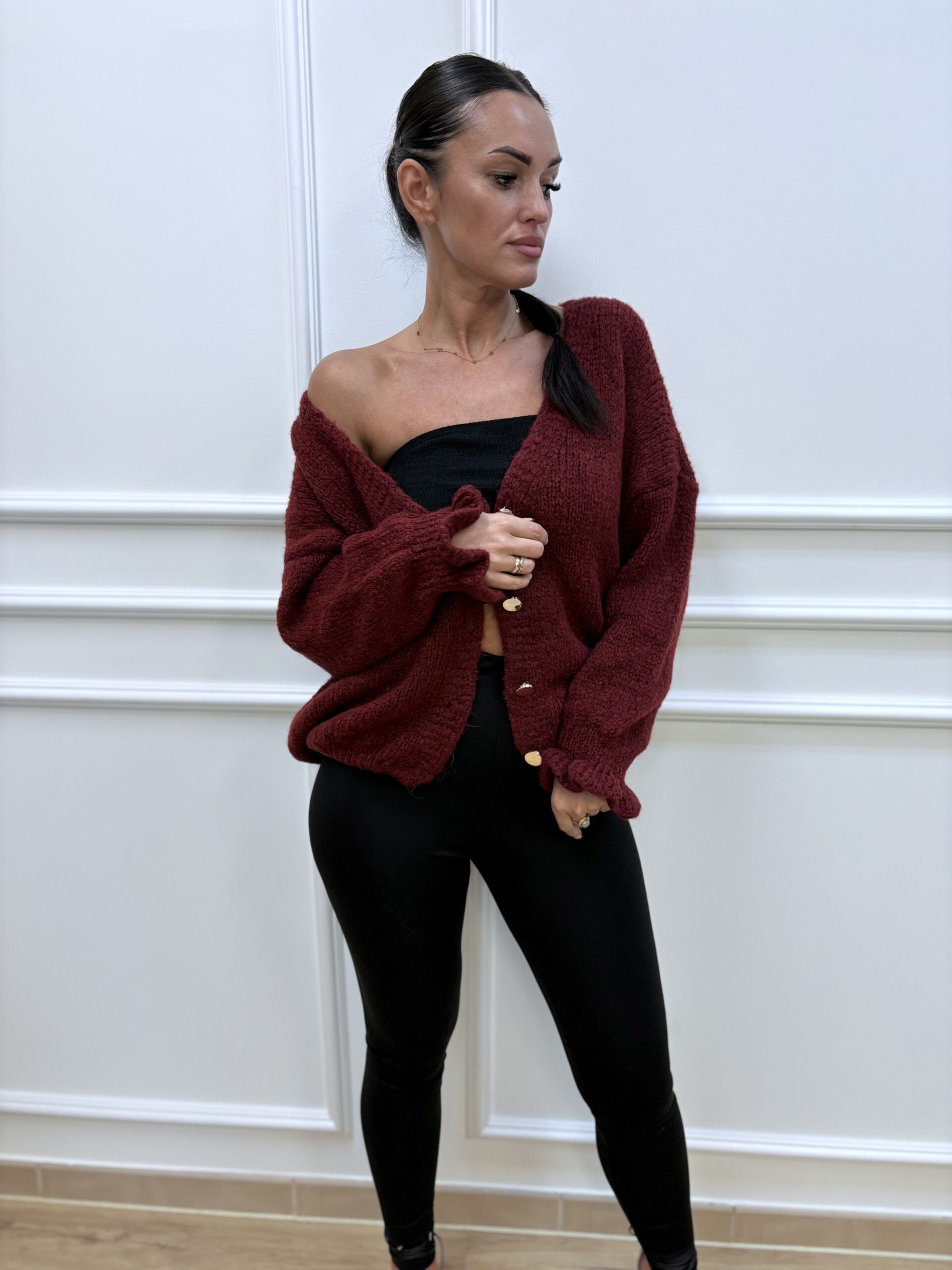 Sweter rozpinany z falbanką przy rękawach- bordowy