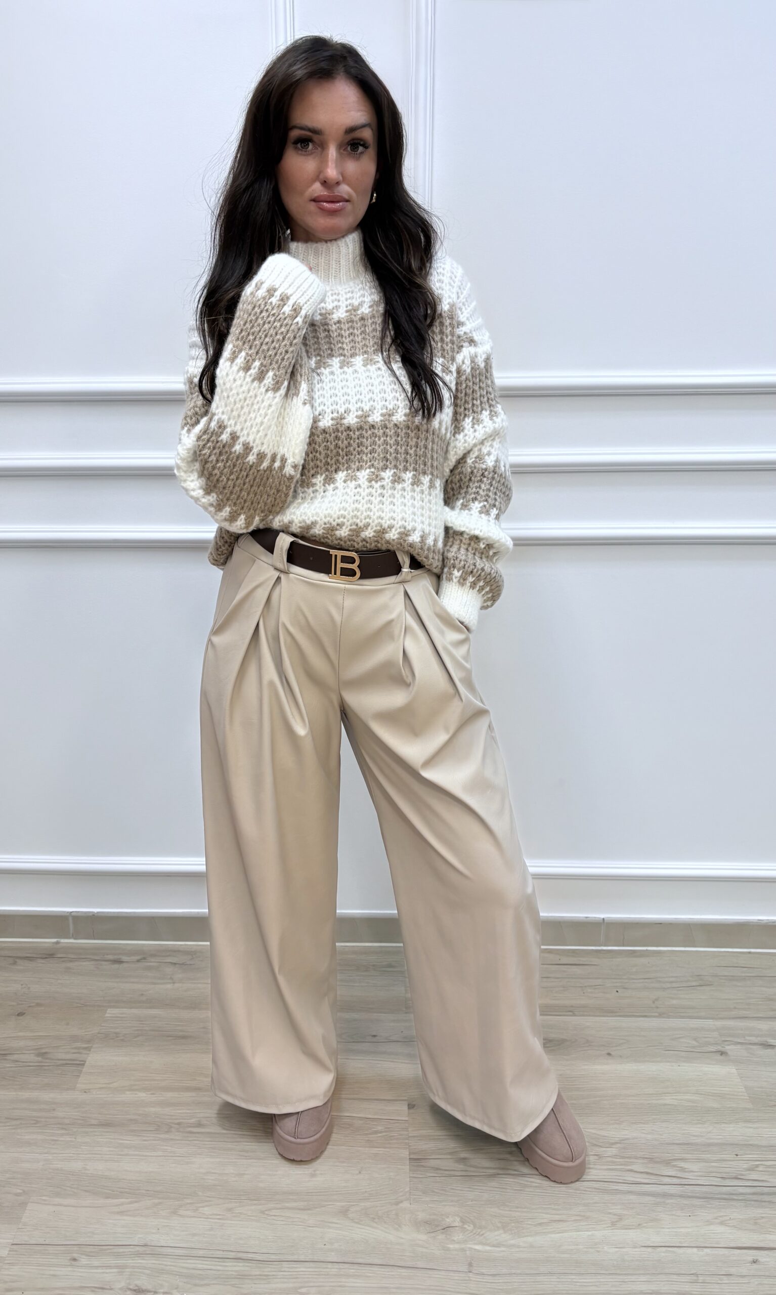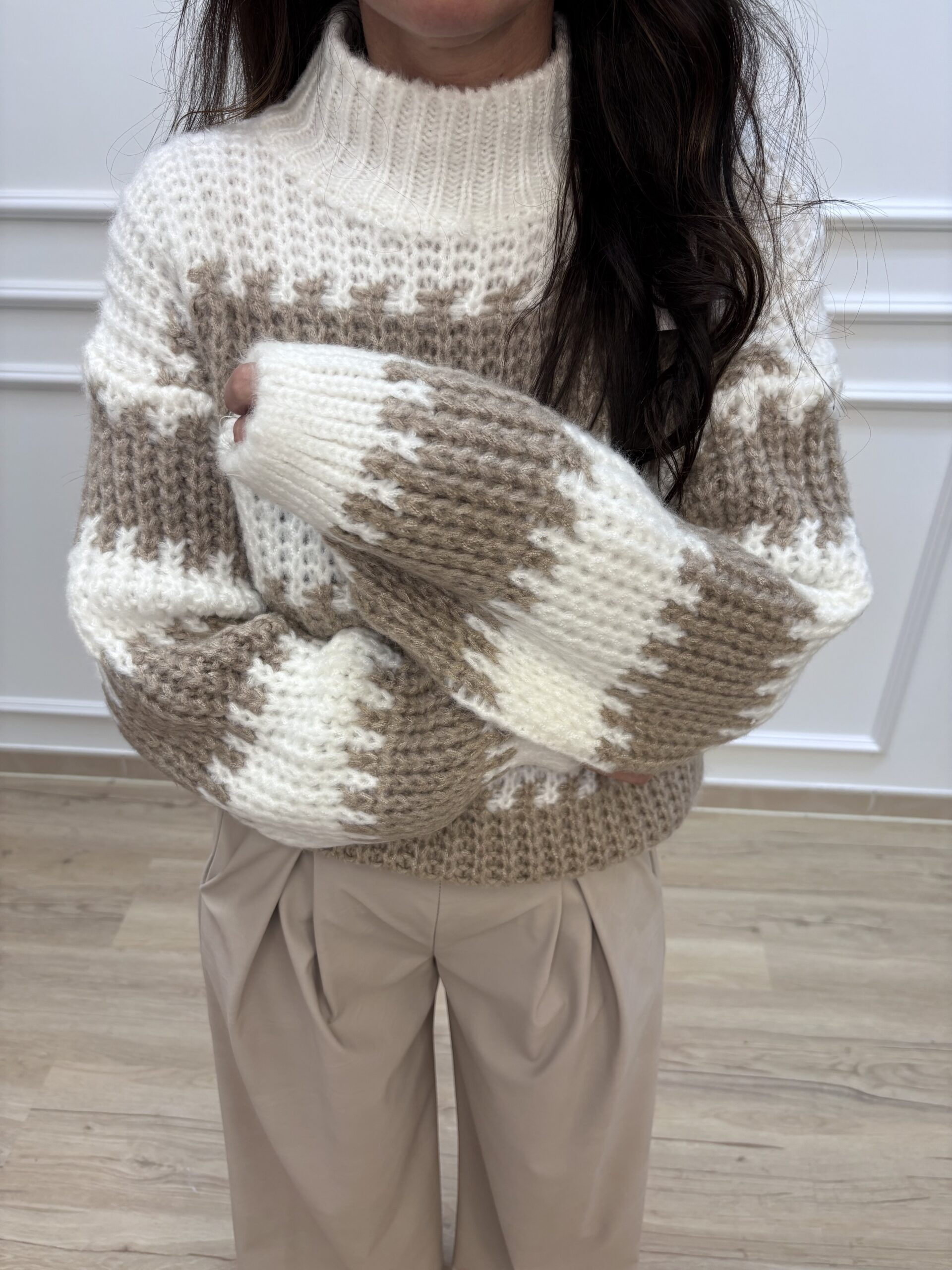 Stylowy i wygodny sweter damski w grubym splocie, utrzymany w modnych odcieniach beżu i ecru. Wykonany z miękkiej, przyjemnej w dotyku przędzy, która doskonale otula i zapewnia komfort w chłodniejsze dni. Luźny, lekko oversize’owy krój nadaje mu nowoczesnego charakteru, a delikatny półgolf dodaje elegancji i ciepła.